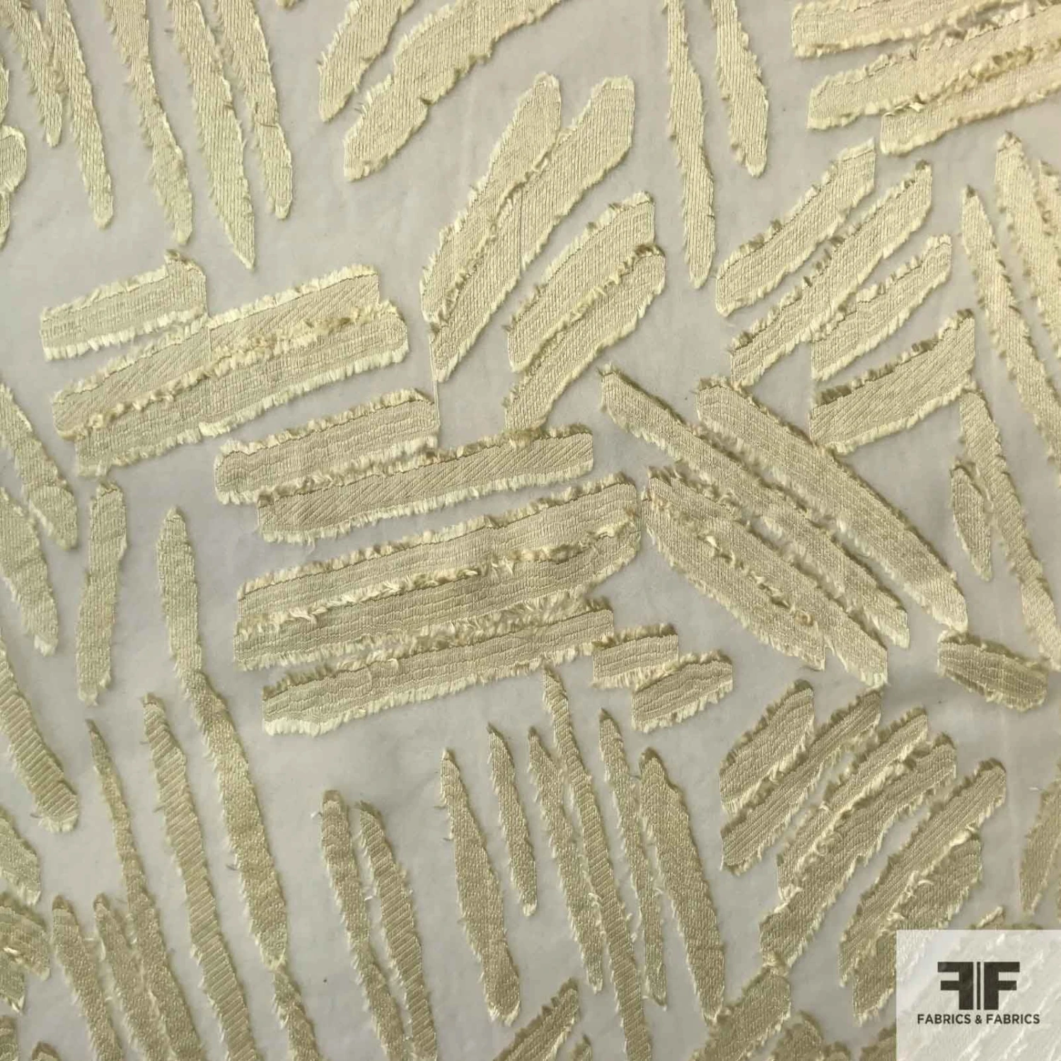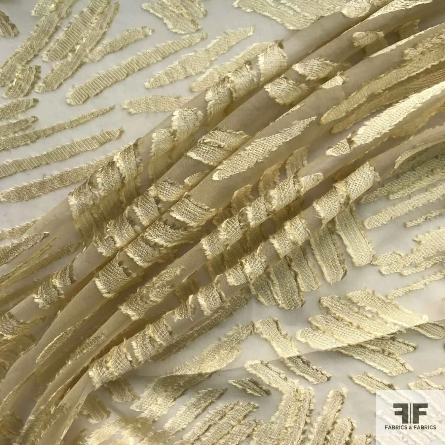 This fil coupé silk chiffon, by local NYC couture designer, features an abstract geometric mixed rayon pattern repeat in candlelight chiffon. This piece makes a dramatic statement, and would be perfect for a cocktail dress or dressy blouse.