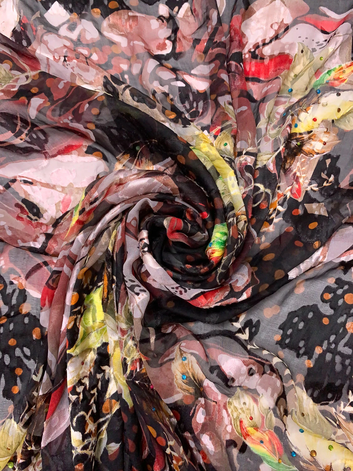 Be the first to review “Abstract Floral Printed Silk-Rayon Burnout Chiffon With Stones – Dusty Rose / Red / Black / Yellow” Cancel reply