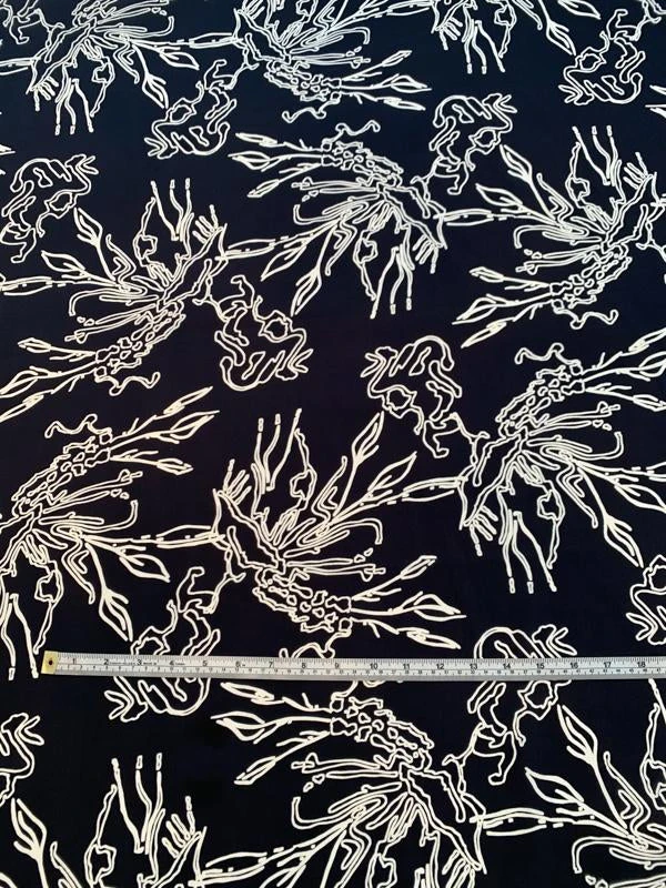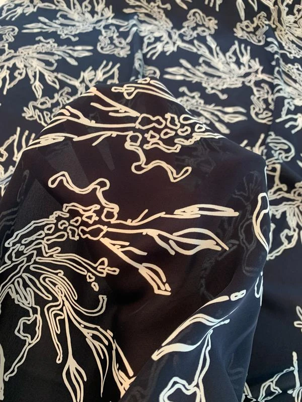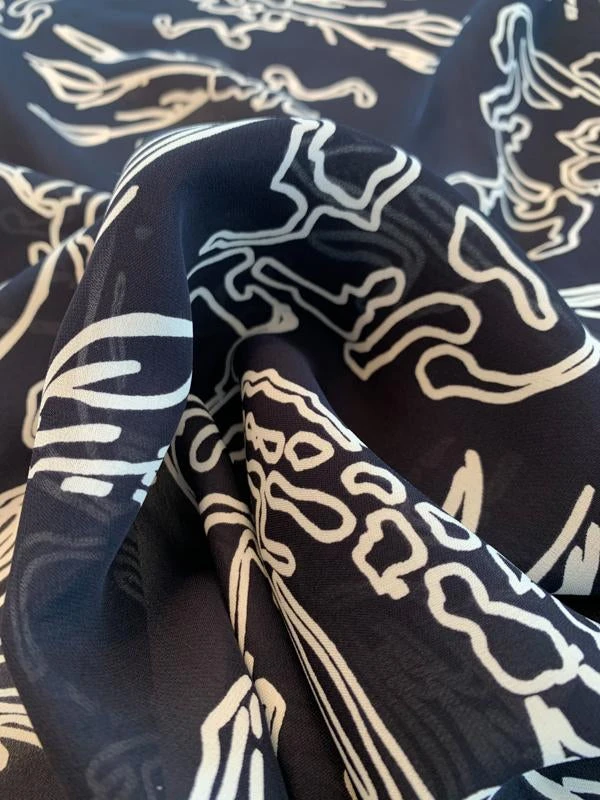 This navy and white abstract printed silk georgette designer fashion fabric has a dignified, authoritative feel.