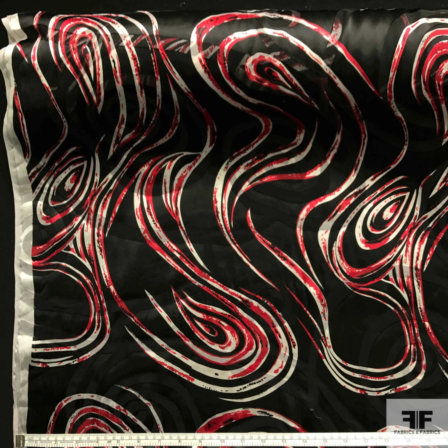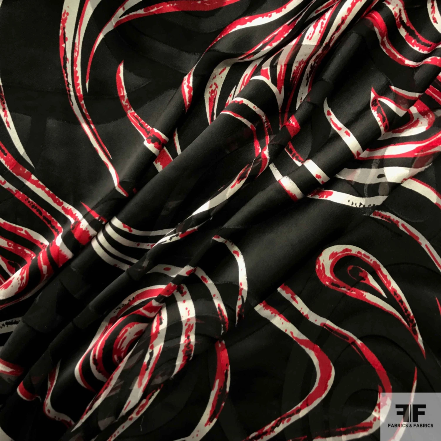 This black, red, and white burnout is printed with a unique pattern of water droplet shapes rippling into larger shapes. This pattern is accentuated by a swirling pattern created by the burnout. Ideal for a striking statement piece: kimono, dress, caftan to name a few.