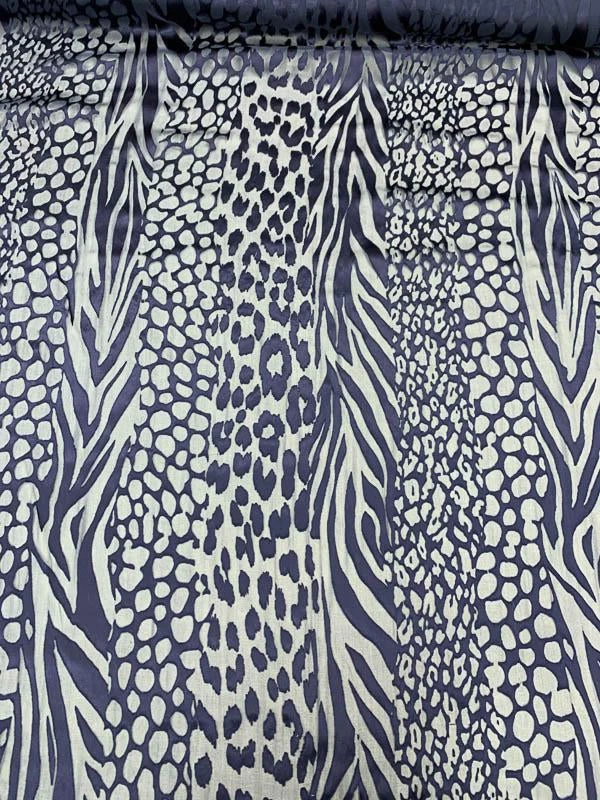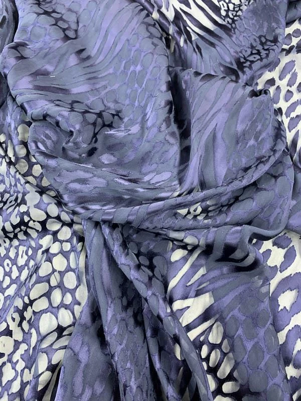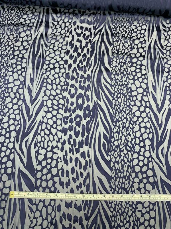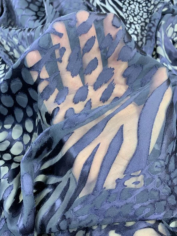 The rich navy blue color makes the print really pop on this animal pattern burnout chiffon European designer fashion fabric.