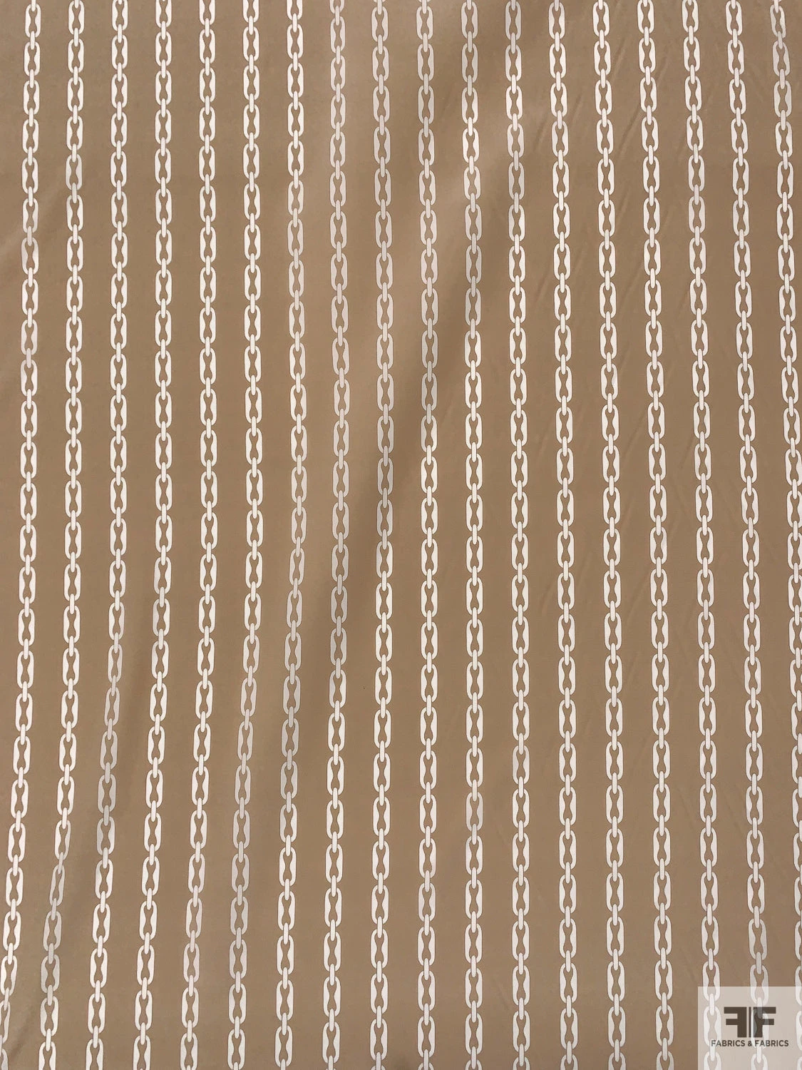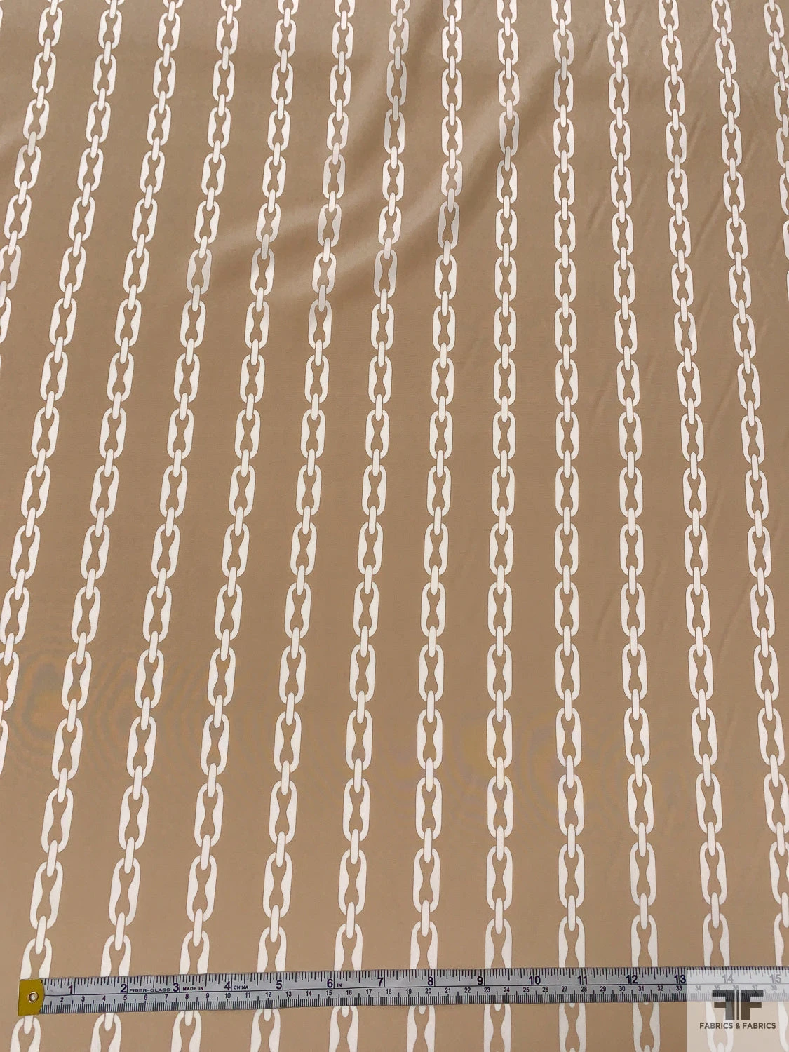 A classic chain link print adds a touch of refinement to this silk crepe de chine. The fabric’s fluid drape and soft texture make it ideal for effortlessly chic blouses, dresses, and scarves. Its timeless pattern exudes quiet luxury, making it a versatile wardrobe staple. Originally created for Nili Lotan, it reflects the brand’s polished yet relaxed aesthetic.