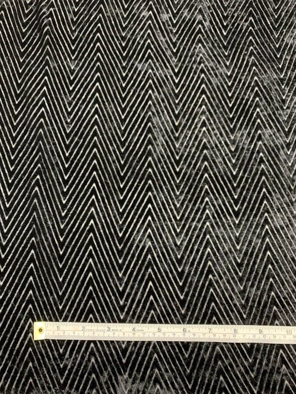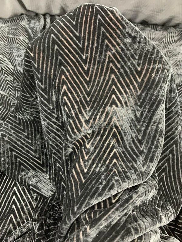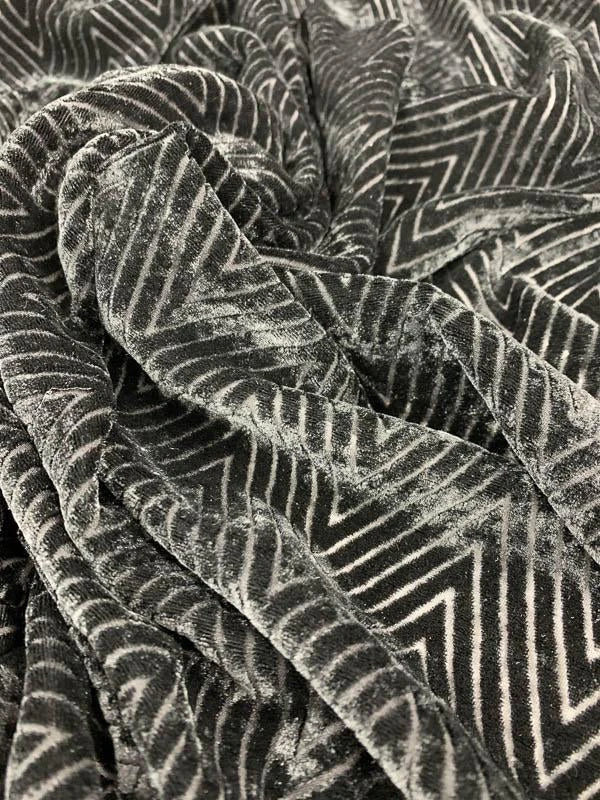 Made in Italy, this black chevron cut velvet is a striking fusion of texture and transparency. Featuring a bold chevron pattern with semi-sheer burnout-style detailing, it offers a soft napped surface, a medium to heavy weight, and a generous drape that moves beautifully. Rich and dimensional, this fabric is perfect for dramatic evening gowns, luxe skirts, tailored jackets, or sheer-paneled statement dresses. A sophisticated choice for designs that demand both structure and allure.