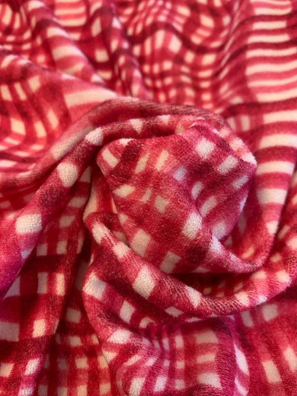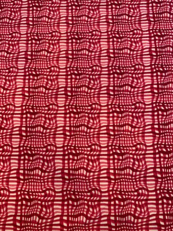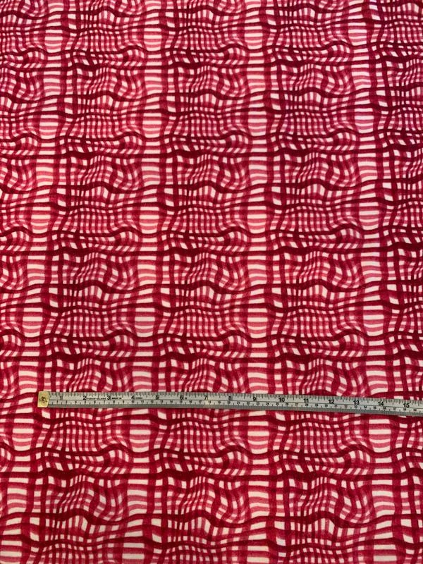 The deep red color on this broken gingham check printed micro terry knit designer fashion fabric in magenta and white is made richer by the wavy, asymmetric lines.