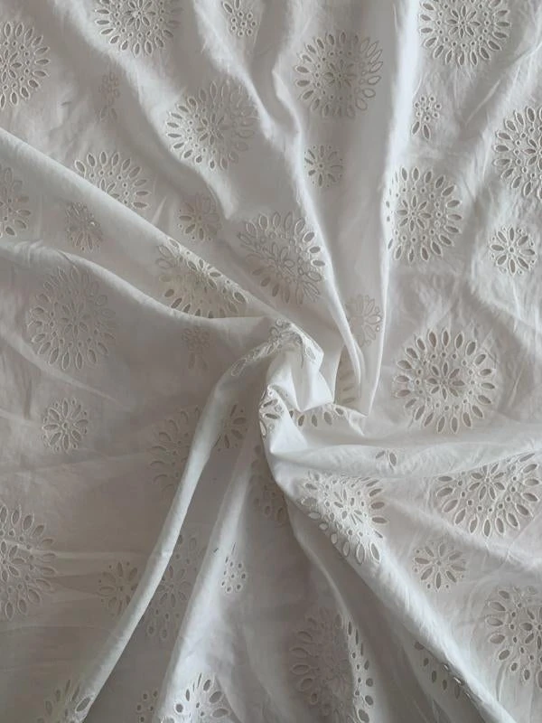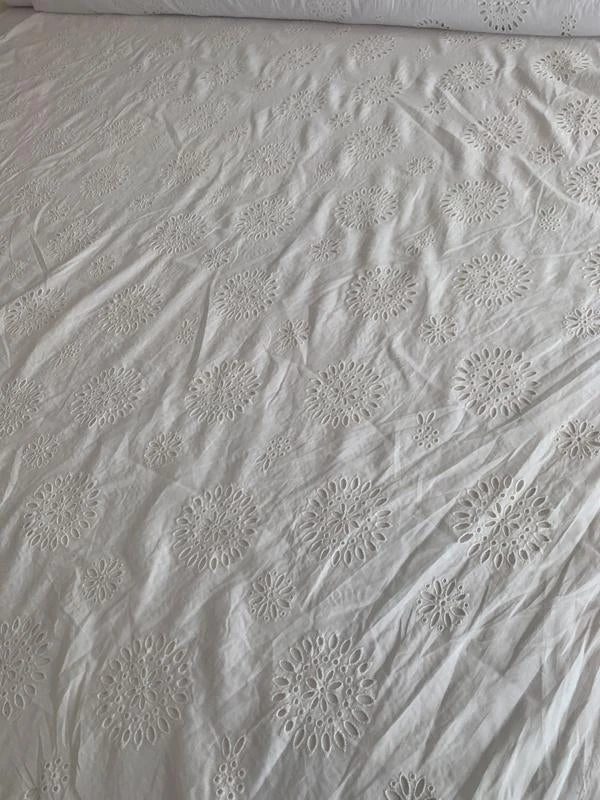 The bright white color is enhanced by the simple patterns on this floral embroidered cotton eyelet designer fashion fabric.