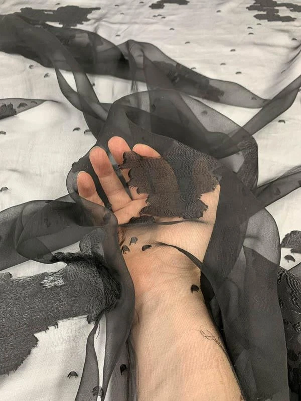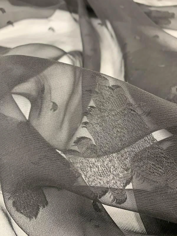 This is a delicate and minimalist black floral gradient fil coupé silk chiffon European designer fashion fabric.