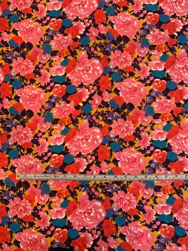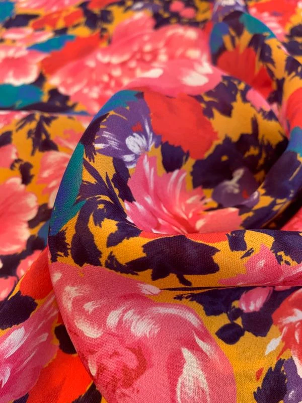 The colorful flowers are vibrant and full of life on this floral printed silk georgette designer fashion fabric in pink, red, purple, and tangerine.