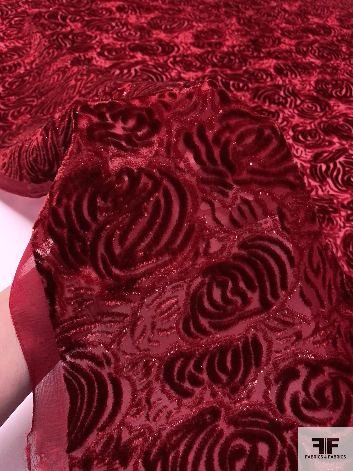 Fiery and luxurious, this French cut velvet features bold floral head motifs in a vivid reddish orange, accented with subtle Lurex shimmer. The napped texture and generous drape give it movement and richness, perfect for flowing gowns, dramatic caftans, or standout costume pieces. A radiant fabric that brings warmth and glamour to any design.
