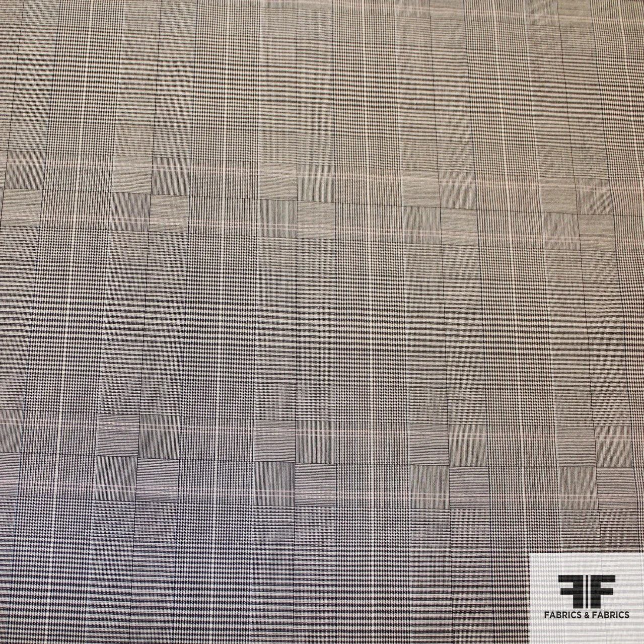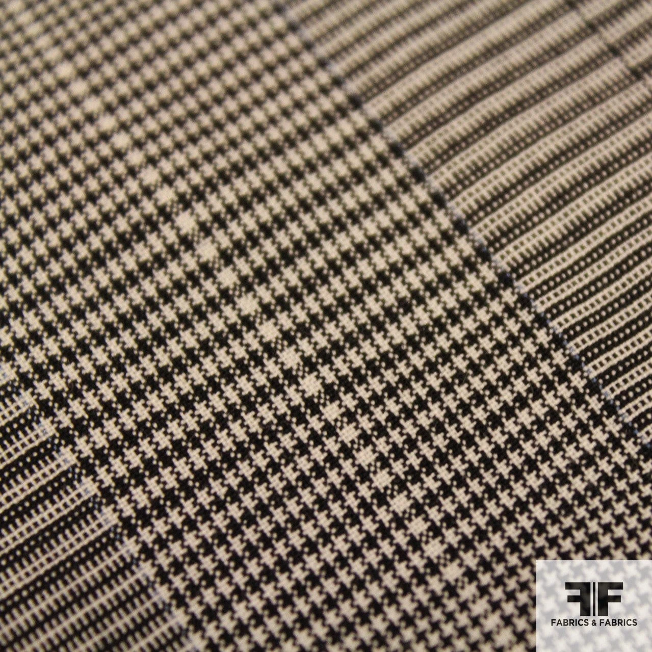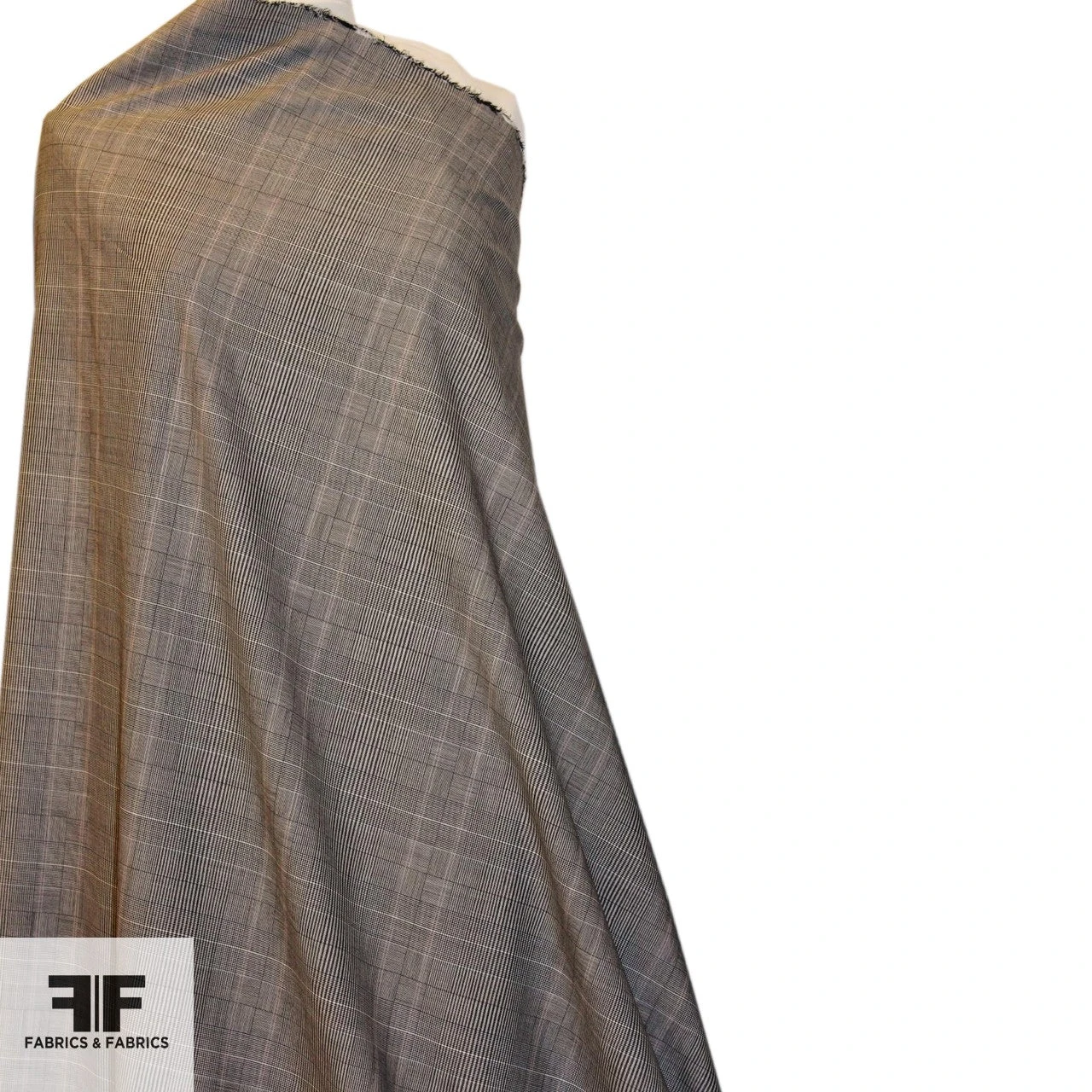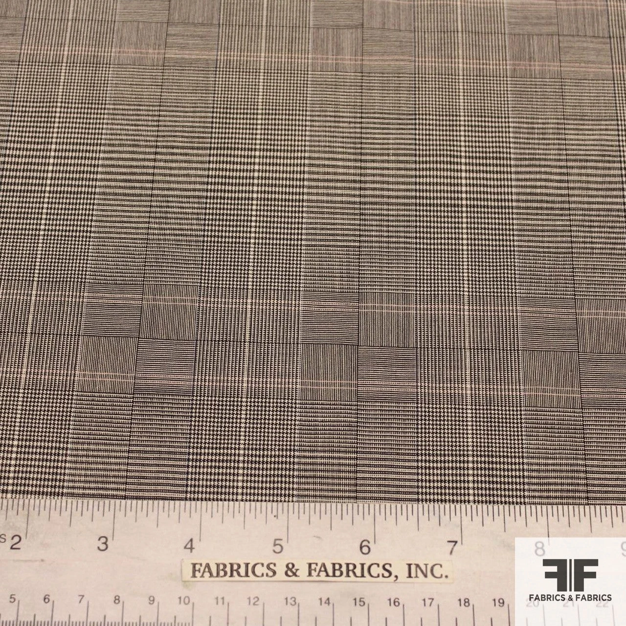 This refined wool suiting in black and white has boxes, stripes, and tiny houndstooth patterns woven into a subtle plaid design. Bands of tiny houndstooth pattern are 1.25” wide. Also, multicolor single thread stripes of pink and baby blue fall into the plaid and add highlights to the designs. Suitable for tailored suits, tailored dresses, skirts, and jackets.