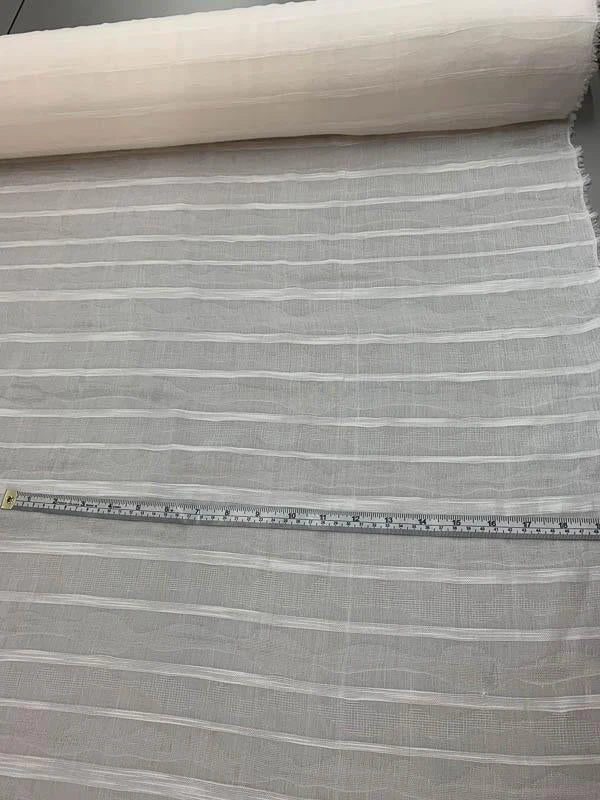 This is a gorgeous sheer striped jacquard cotton. Between the stripes a subtle wavy pattern is woven, giving the fabric complexity and fun differentiation. Translucent in nature, transform this material into billowy blouses or line it in the creation of fabulous boho skirts and dresses.