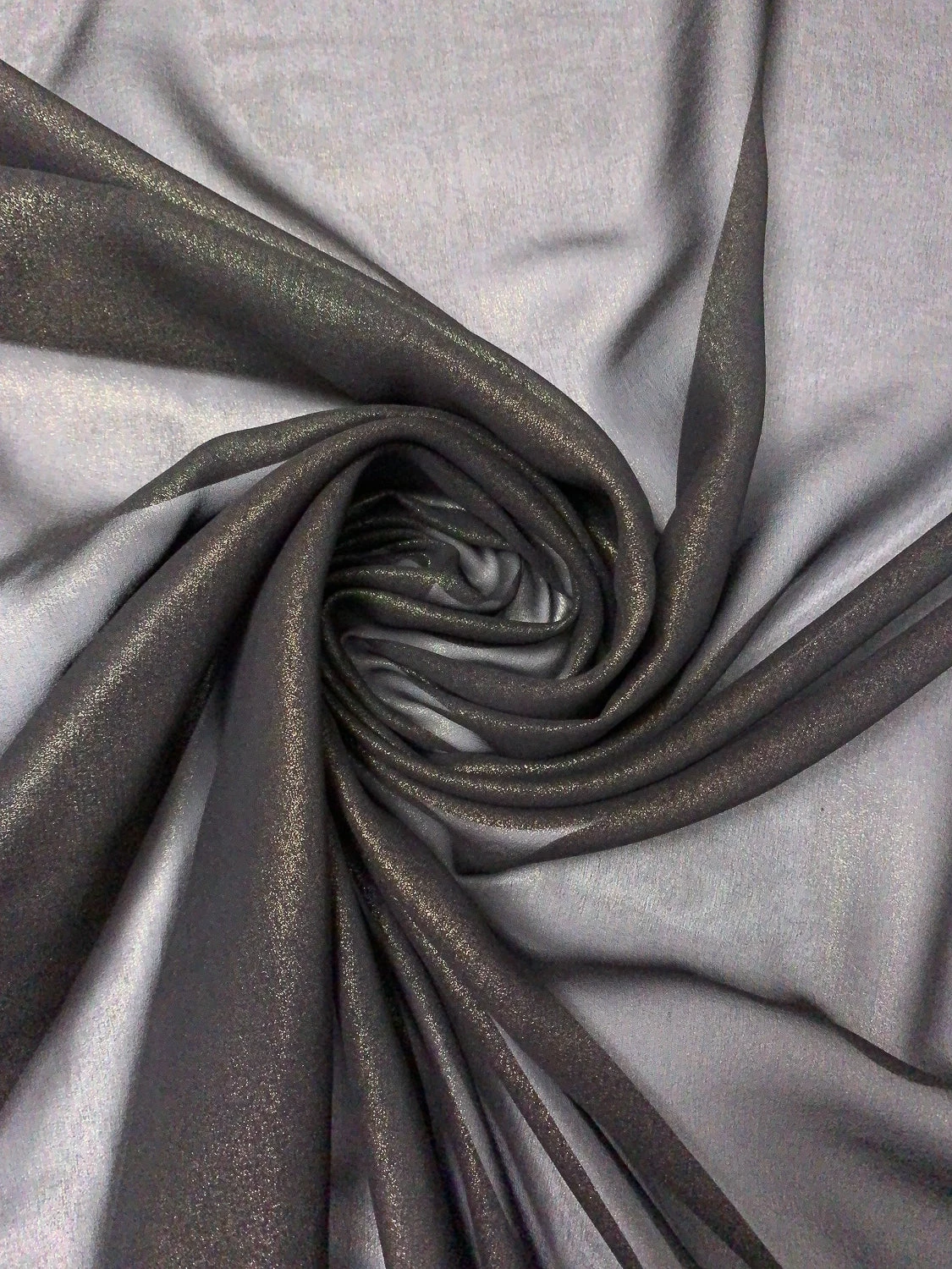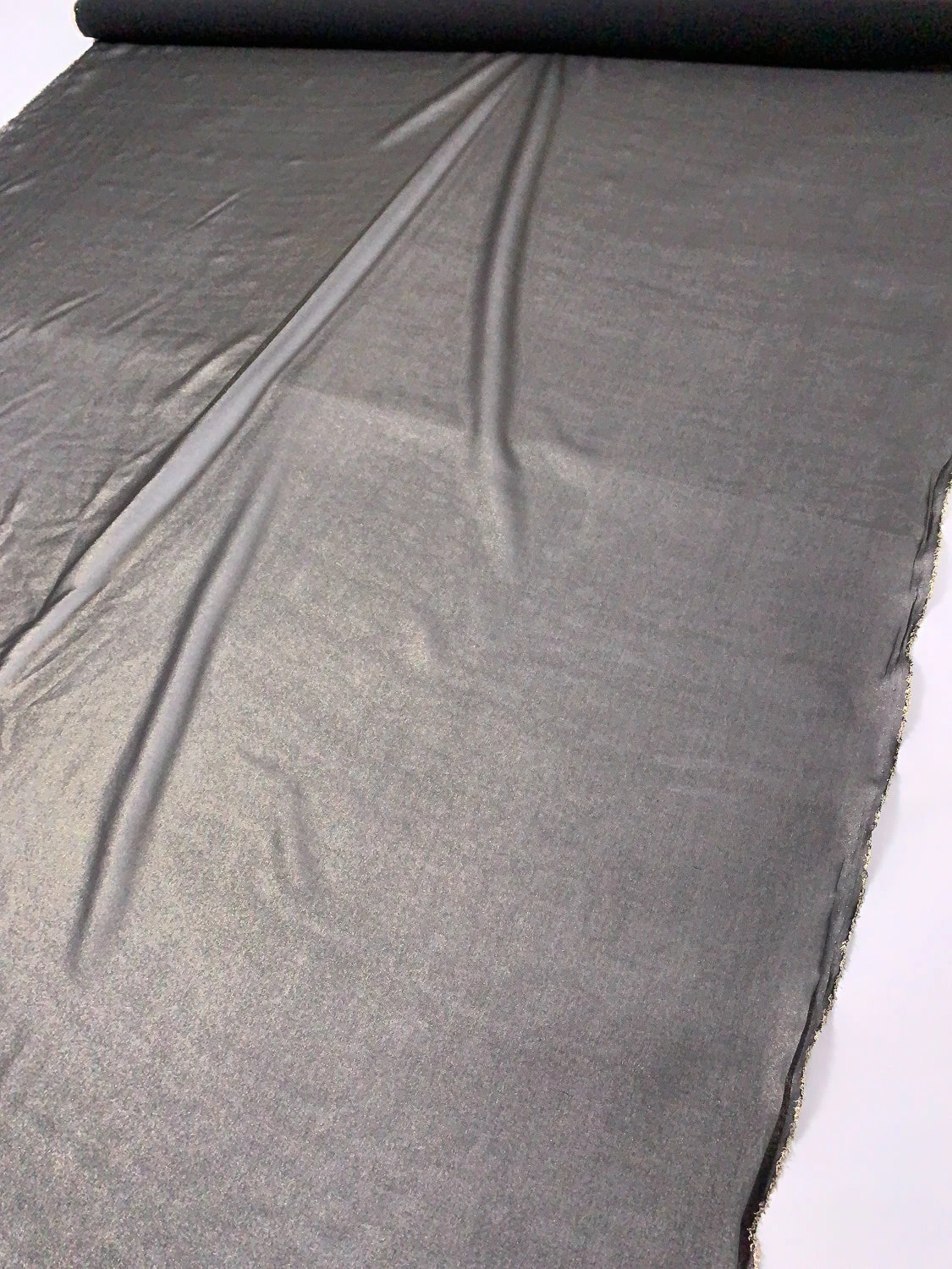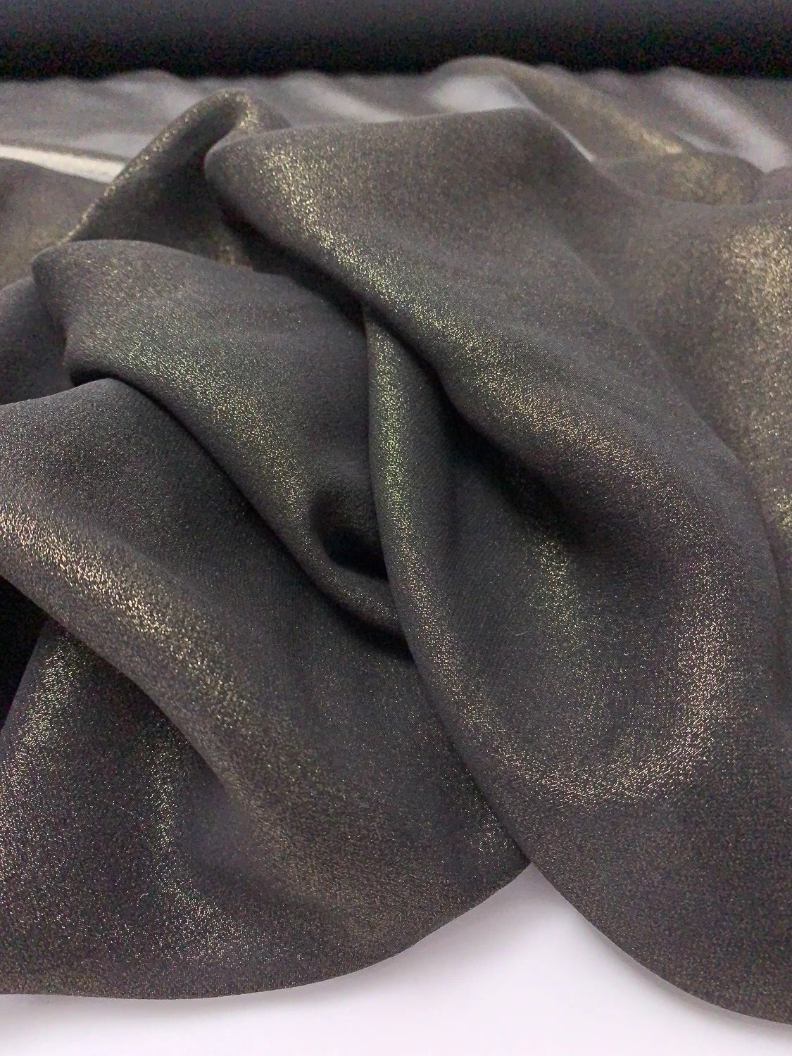This Italian-made silk chiffon features a subtle gold foil print over a black base. The airy, sheer chiffon drapes effortlessly, while the metallic foil adds a subtle shimmer, elevating its elegance. Lightweight and ethereal, this fabric is perfect for eveningwear, statement layering, or avant-garde designs. With its refined Italian craftsmanship and luminous finish, it brings a modern edge to timeless silk chiffon.