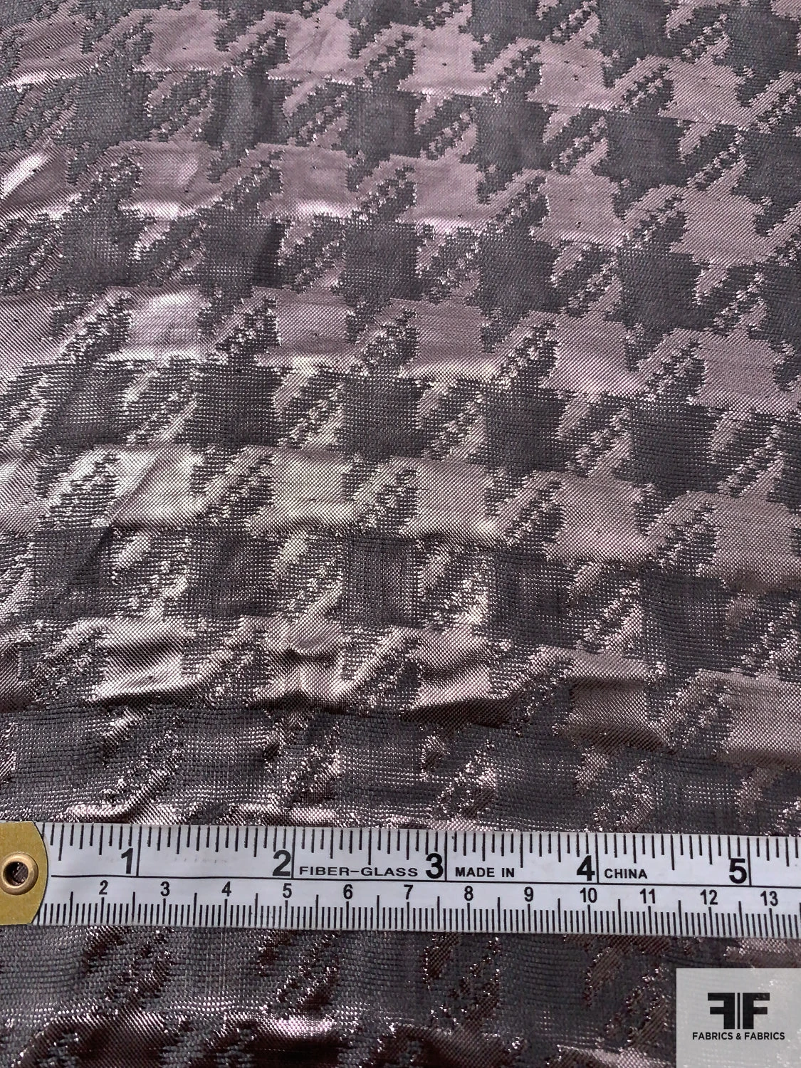 A refined take on a classic, this Italian houndstooth lamé brocade blends soft grey tones with a metallic dusty grey sheen. Lightweight with a crisp drape and grainy texture, it’s ideal for sharp shirting, tailored skirts, or standout tops that play with light and texture in a subtly glamorous way.