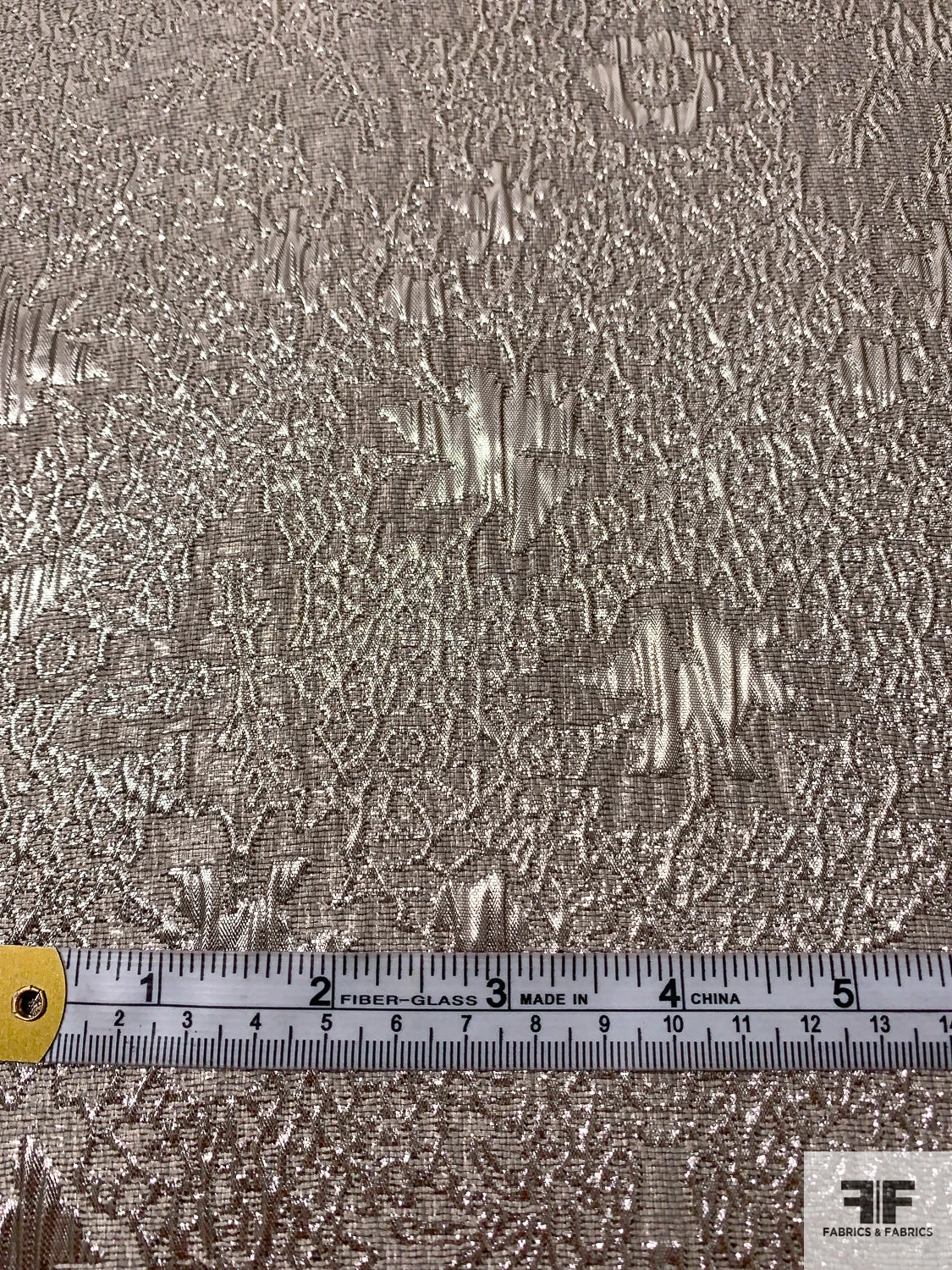 A richly detailed Italian brocade lamé featuring a leaf and floral motif in rhino grey and metallic dark silver. Lightweight with a crisp drape and a soft, textured hand, this semi-opaque fabric is perfect for elevated shirting, structured dresses, or tailored separates with a moody metallic edge.
