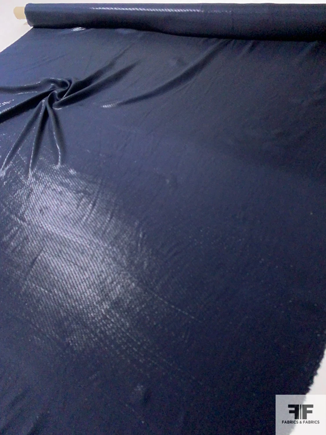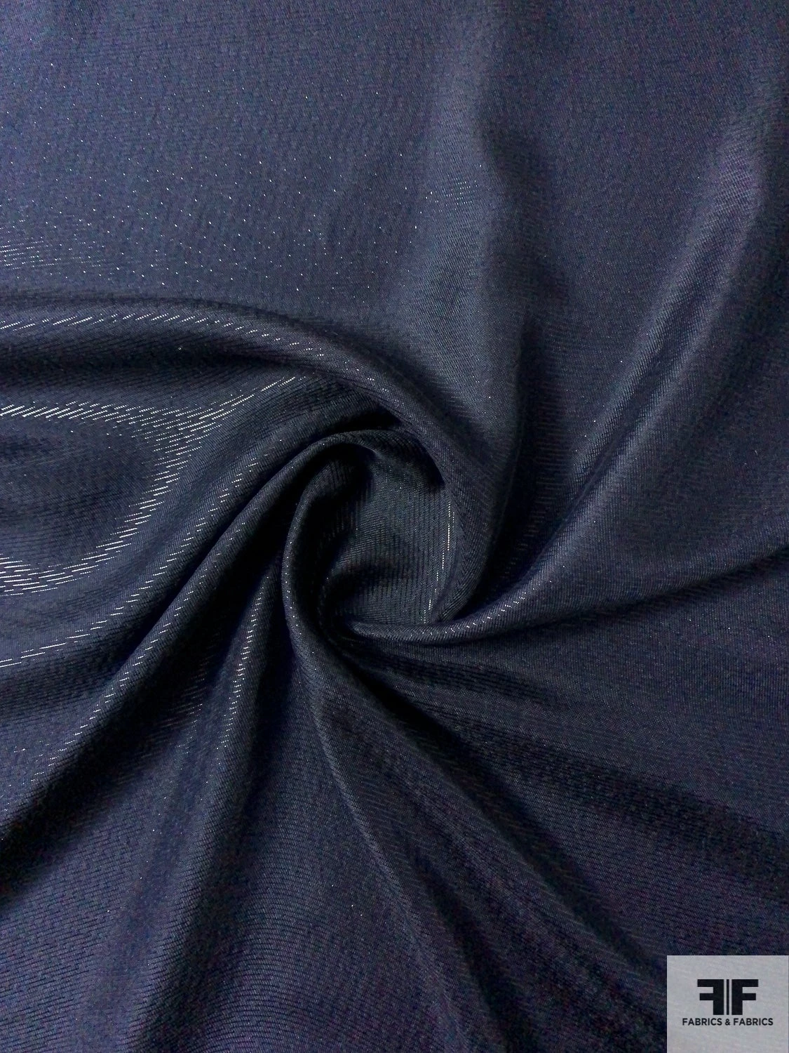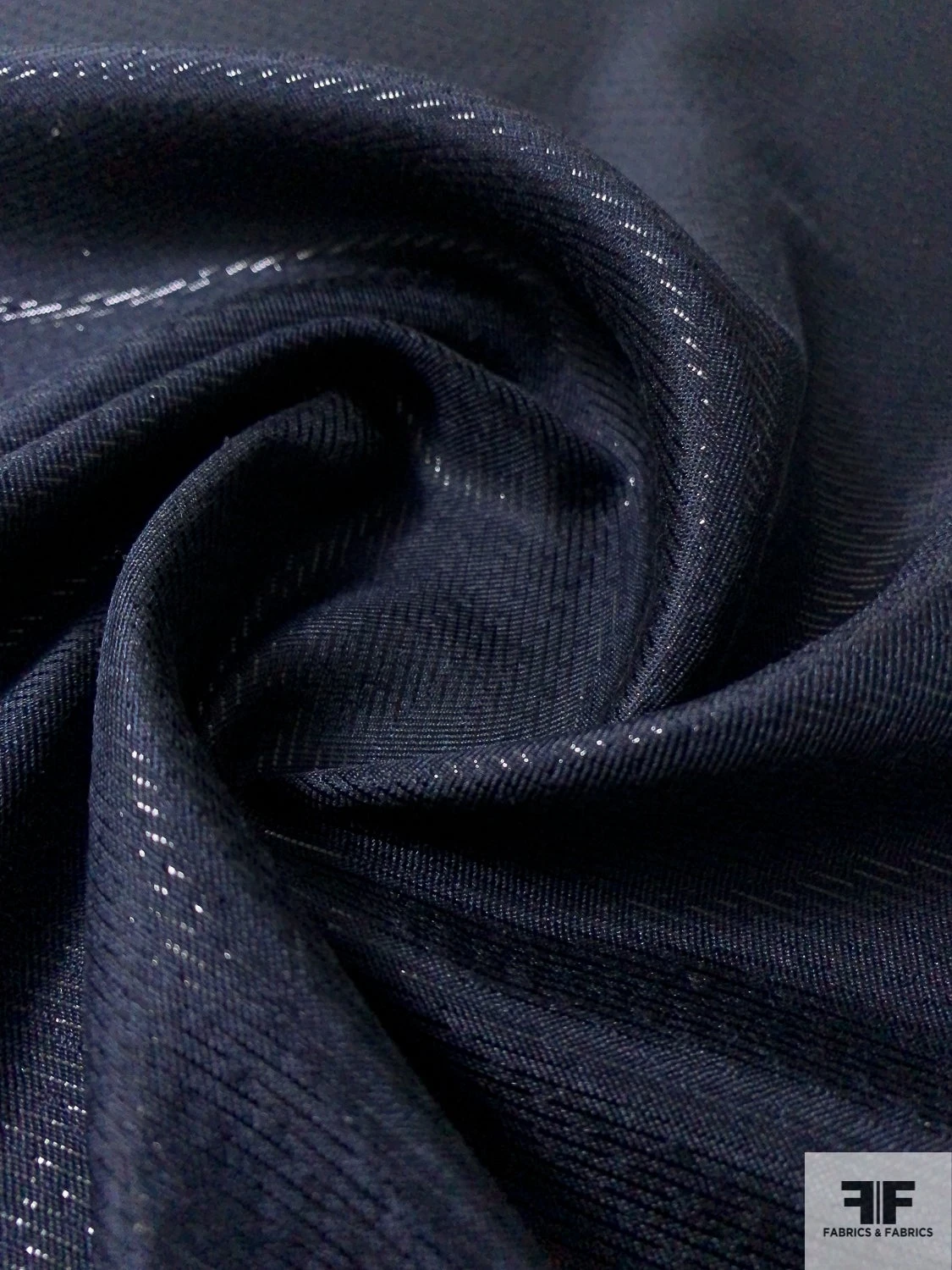 Made in Italy from a 75% silk/25% nylon blend, this lightweight lamé in deep navy features a subtle grainy texture and a whisper-soft sheen. Its generous drape cascades into fluid folds, while the interplay of opaque panels and sheer veil-like sections reveals hints of skin for ethereal allure. Perfect for flowing caftans, draped evening gowns, delicate scarves or lingerie overlays.