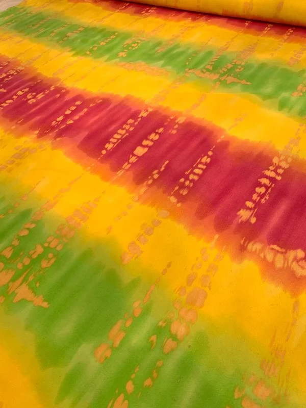 Stunning colors and a beautiful surface finish highlight this Italian tie-dye printed brushed stretch cotton twill designer fashion fabric in yellow, green, and hot pink.