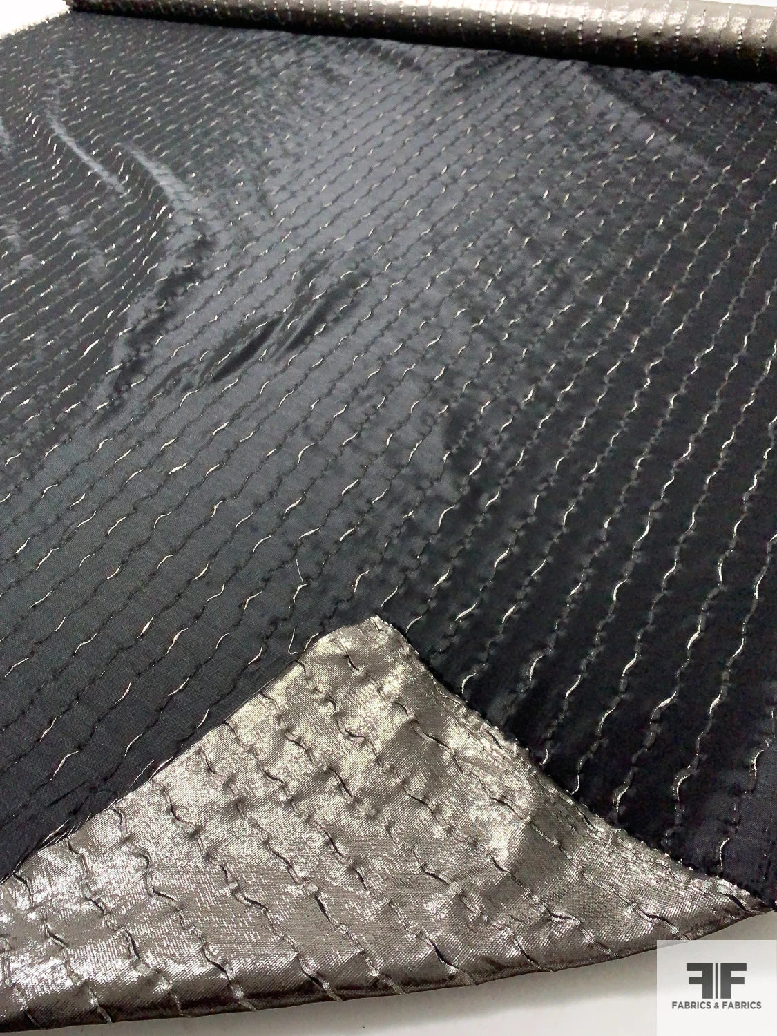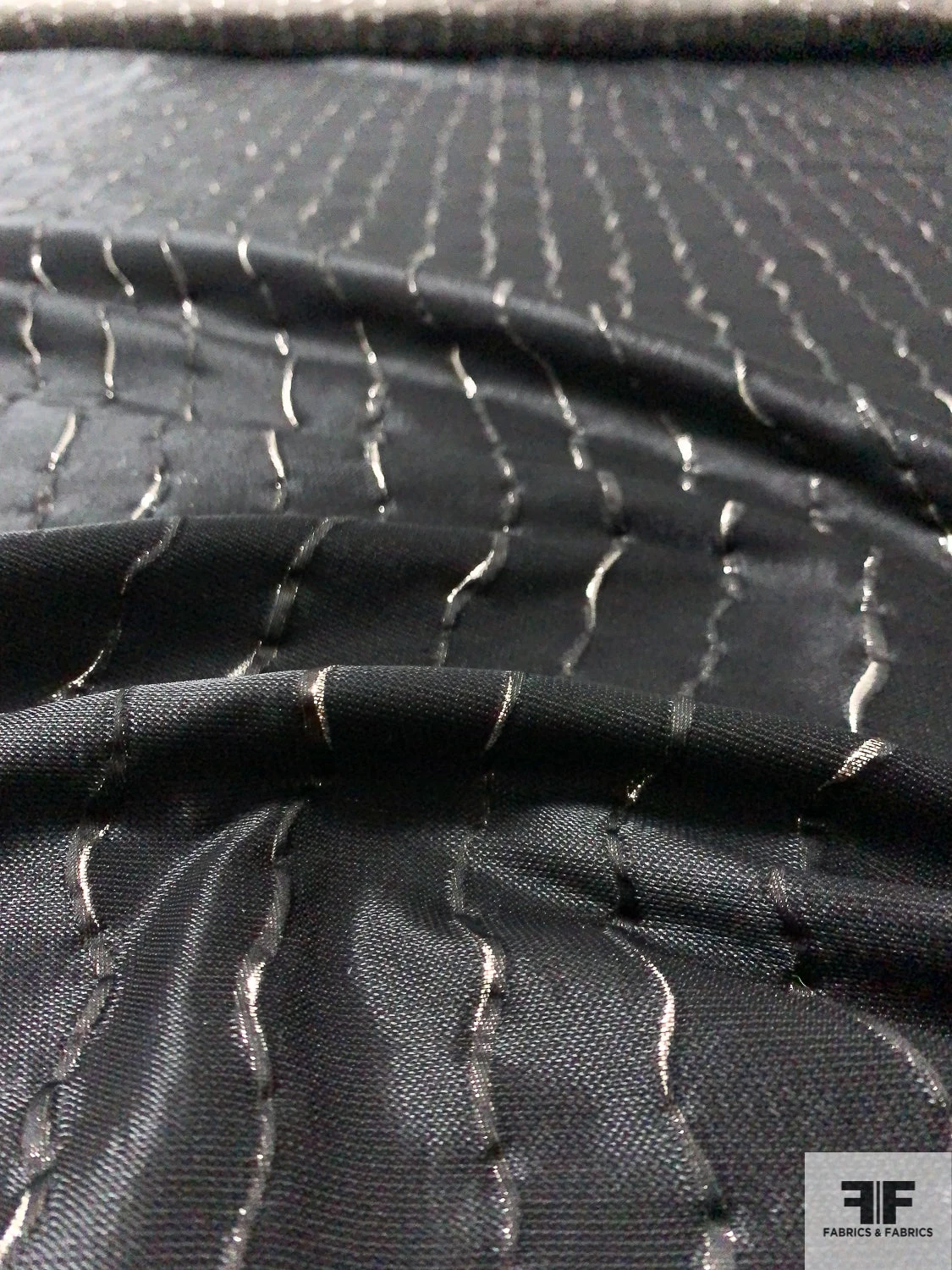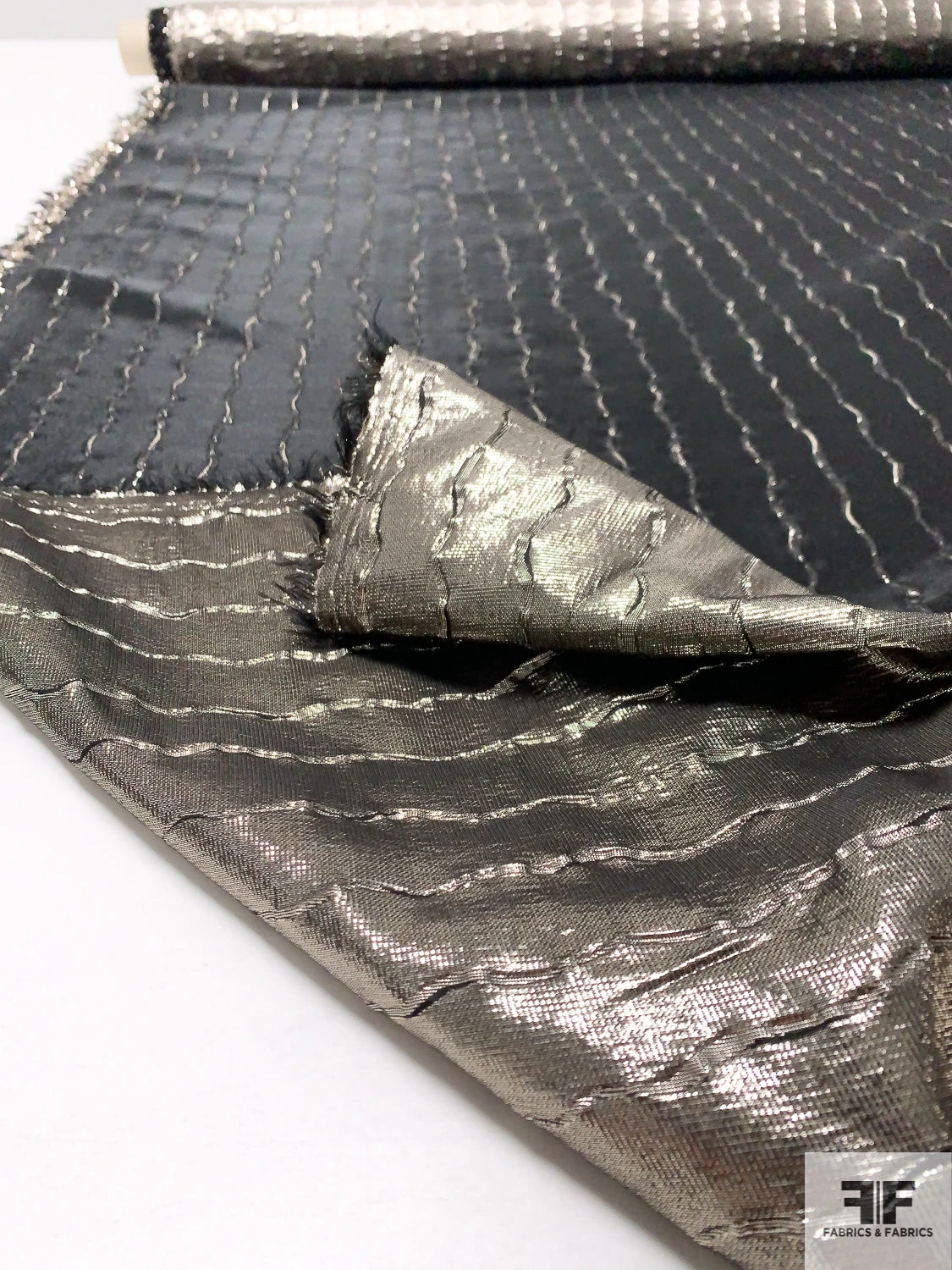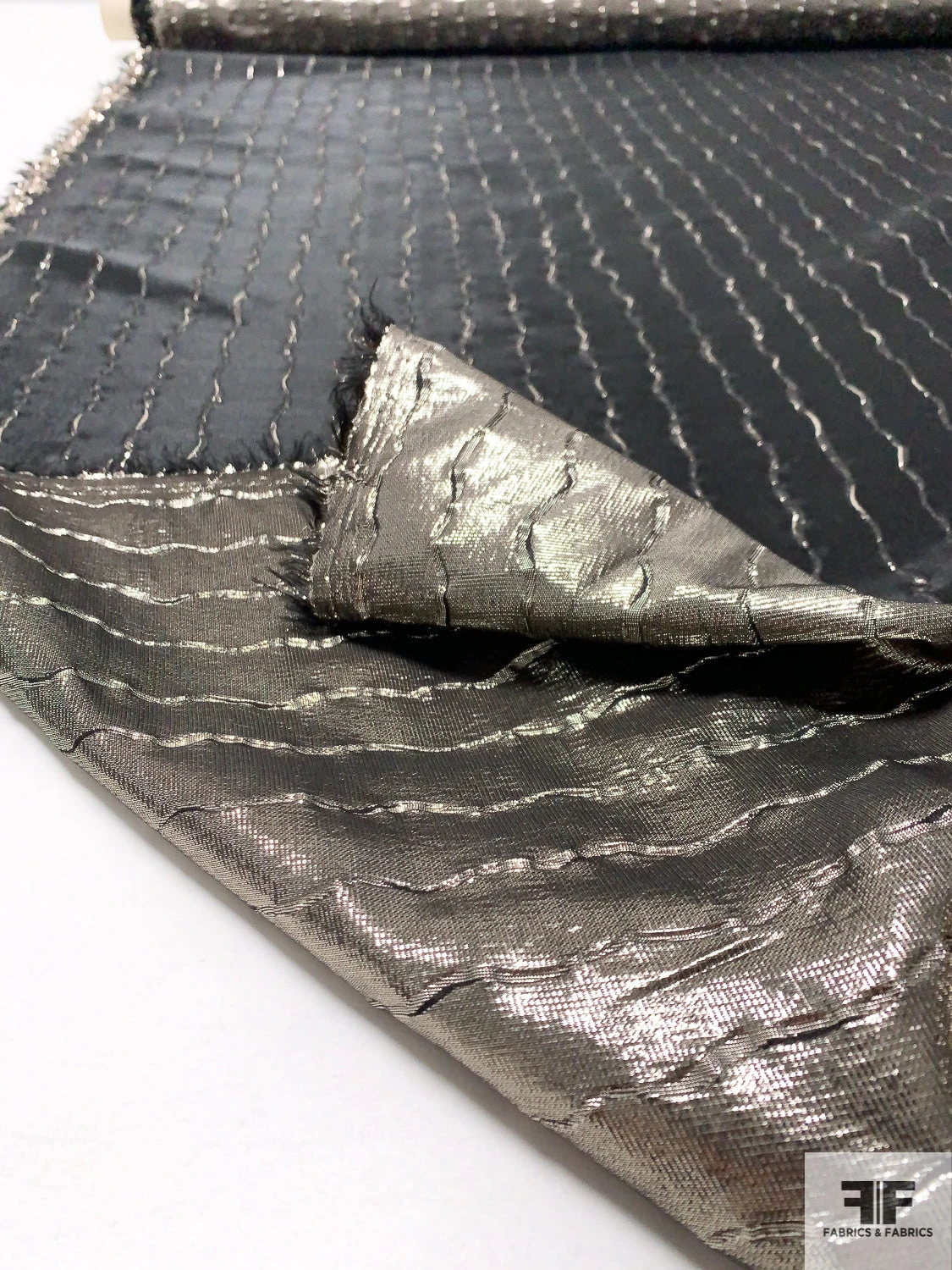 Made in Italy from a lightweight polyester–lurex blend, this lamé showcases vertical wavy stripes in metallic golden taupe and black over a subtly textured surface. Its crisp drape and opaque body give each fold architectural precision, letting the metallic sheen undulate with every movement. The textured weave adds depth and dynamic contrast to the stripe motif. Ideal for a flowing caftan, a sculpted sheath dress, a statement scarf or a sharp, tailored jacket.