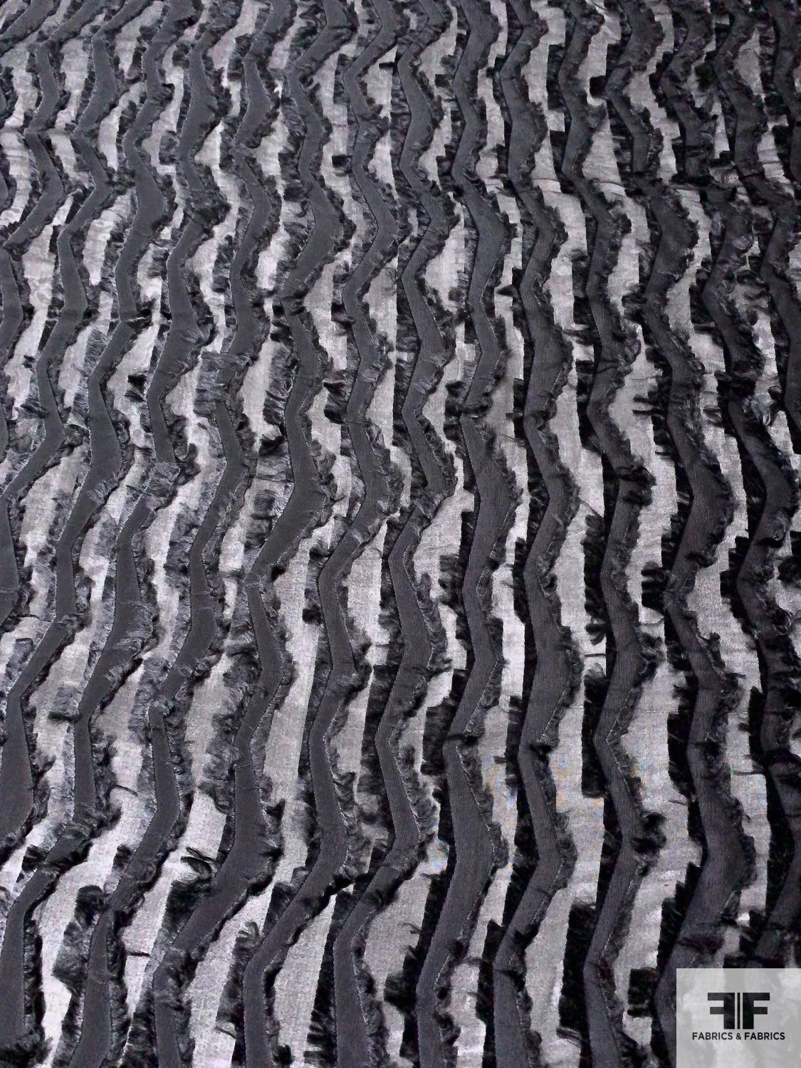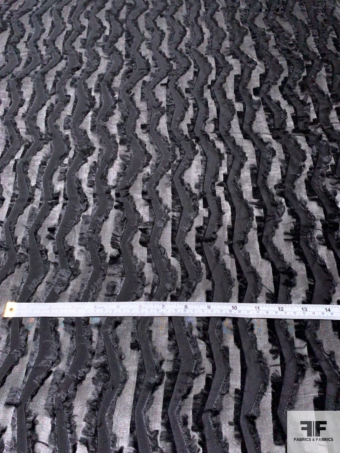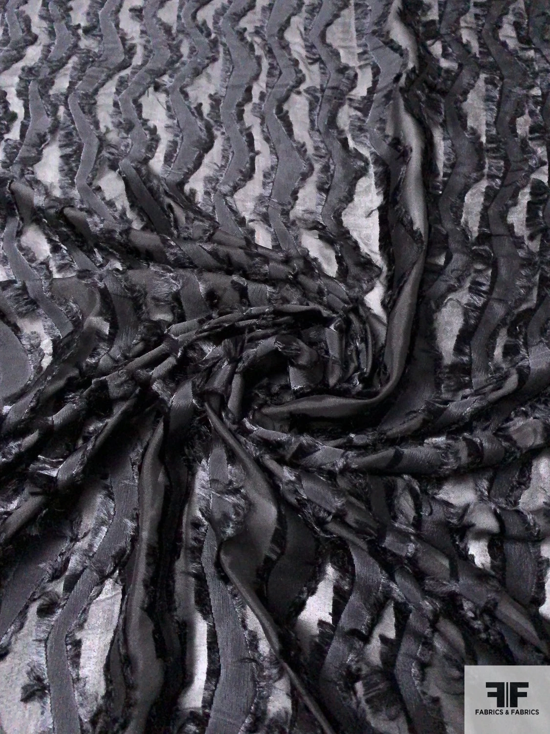 This Italian-made silk chiffon features a black, wavy striped design and a burnout pattern. Its lightweight and airy fabric adds to its charm and drape, making it ideal for showstopping dresses, skirts, and tops.