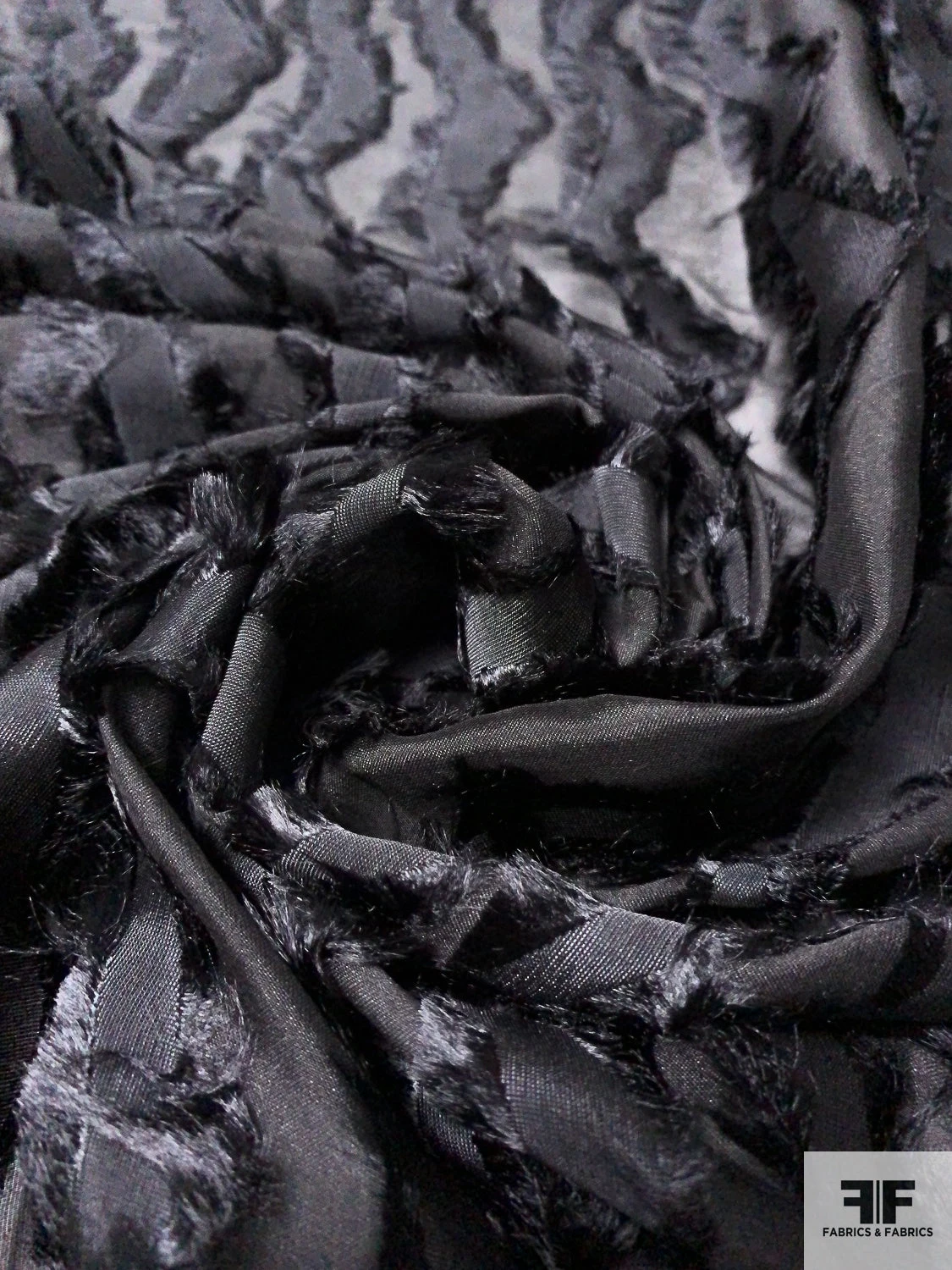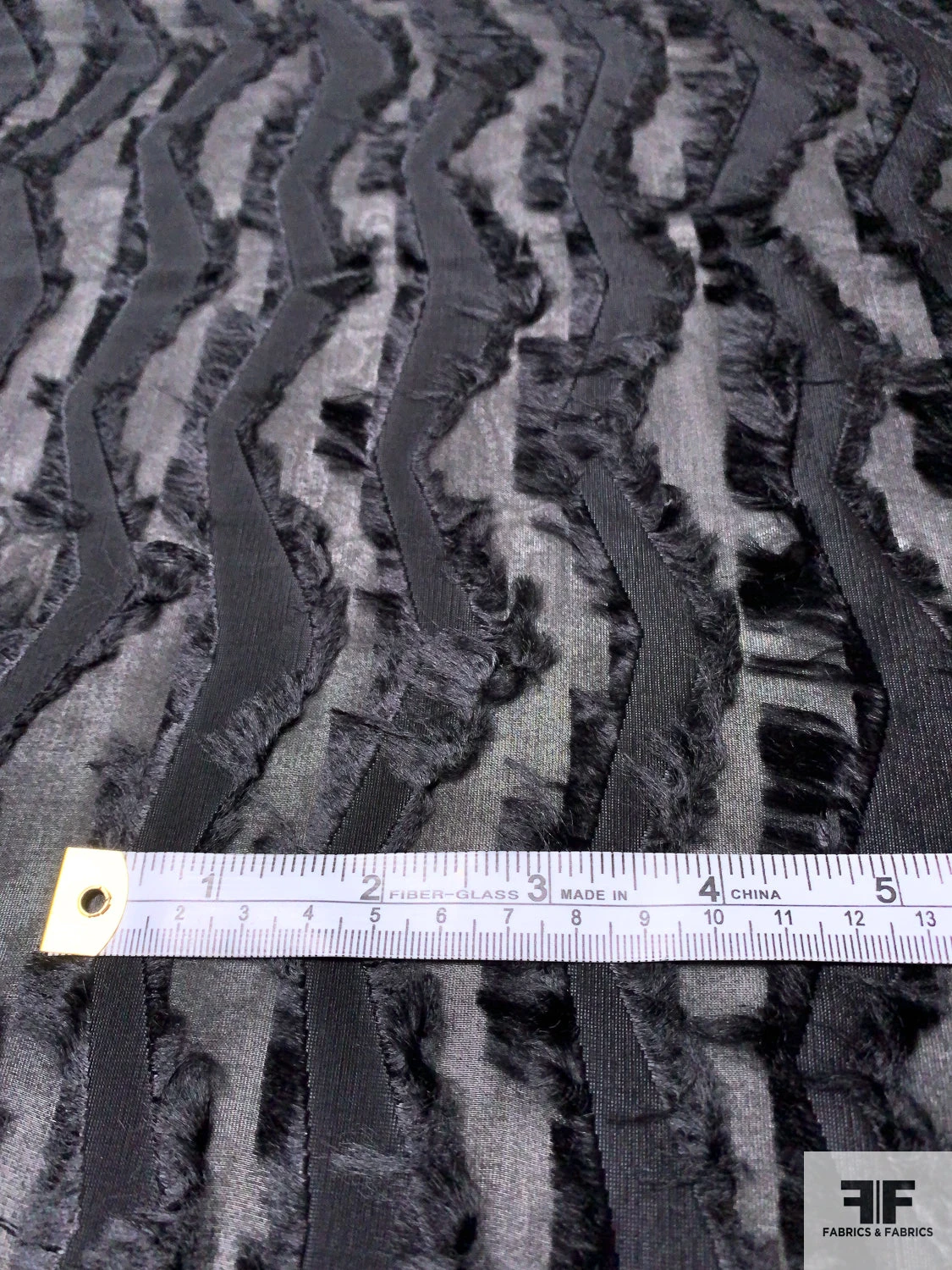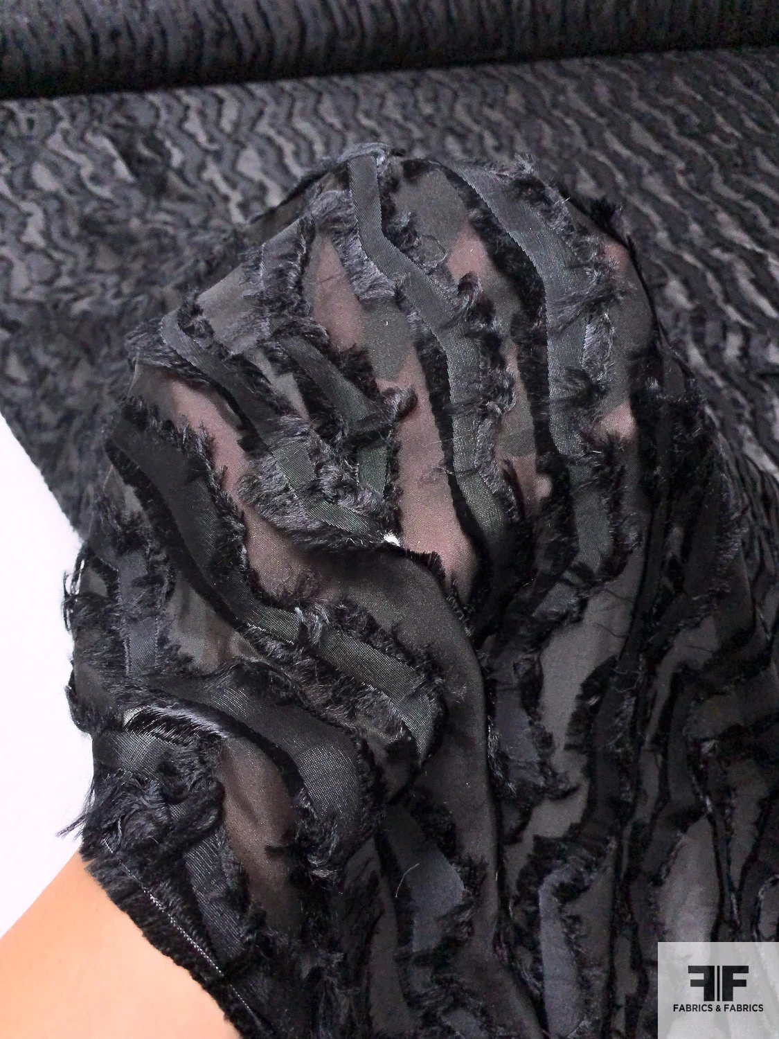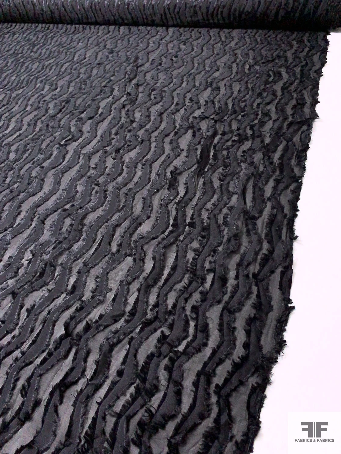 This Italian-made silk chiffon features a black, wavy striped design and a burnout pattern. Its lightweight and airy fabric adds to its charm and drape, making it ideal for showstopping dresses, skirts, and tops.