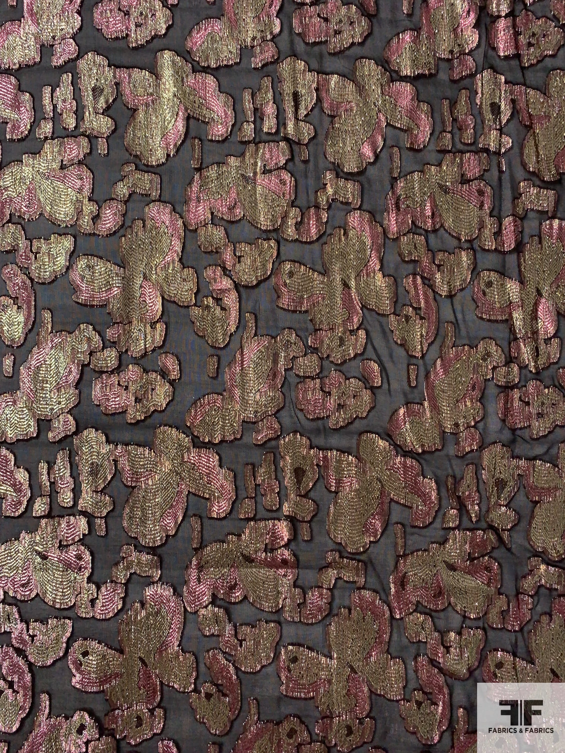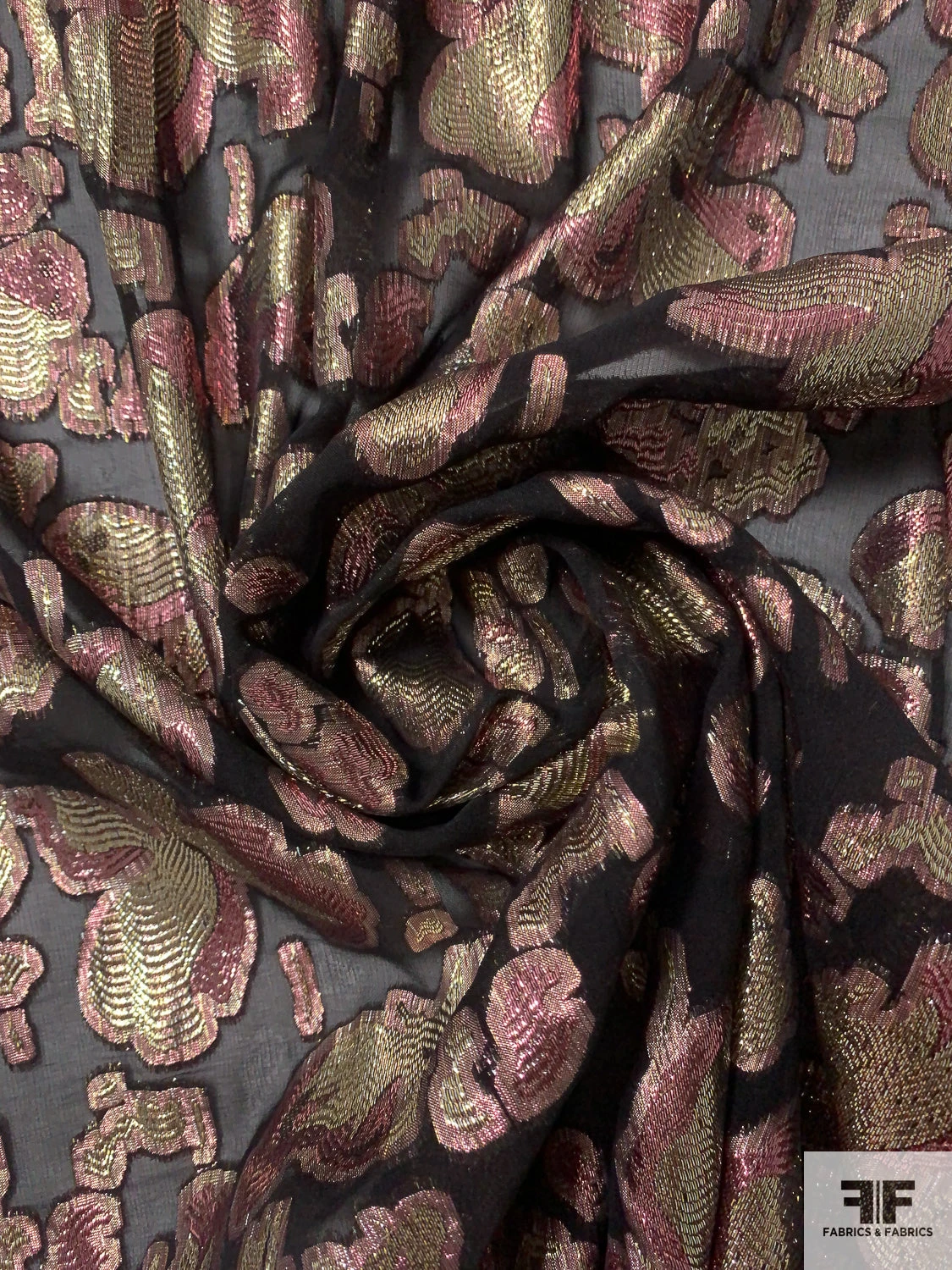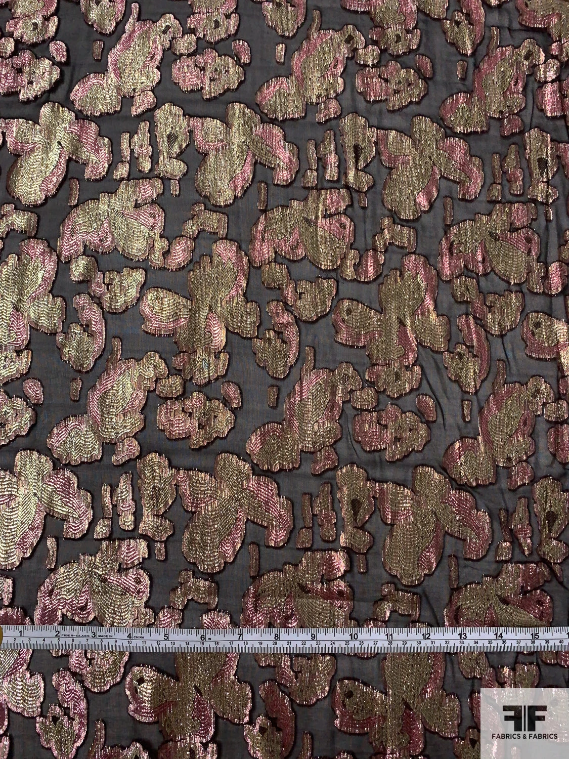 A dramatic statement fabric with a couture edge, this Italian silk chiffon from J Mendel features an abstract metallic fil coupé pattern in shimmering gold, pink, and black. The lightweight chiffon base has generous drape and a semi-sheer finish, while the textured fil coupé threads add dimension and depth. Ideal for standout gowns, sheer layers, or elevated costume design—this one’s for the bold and the skilled.