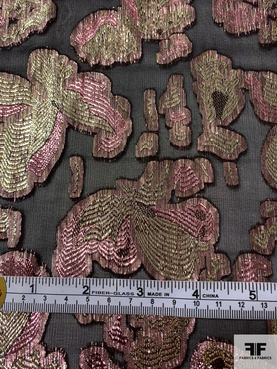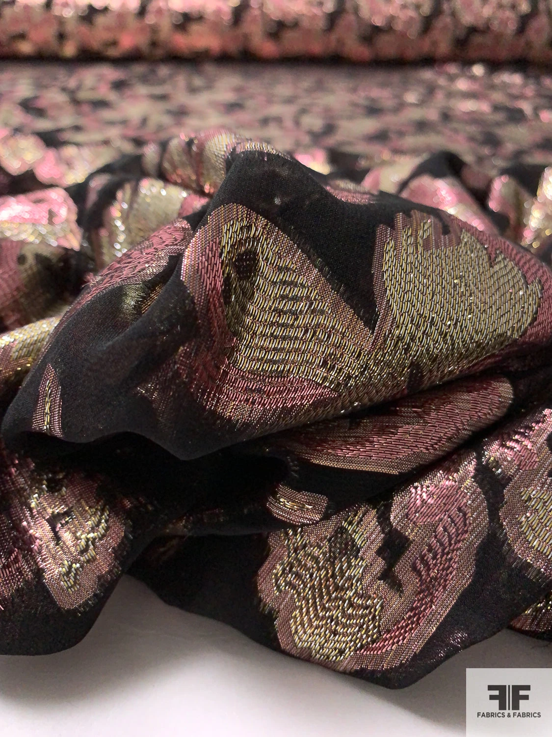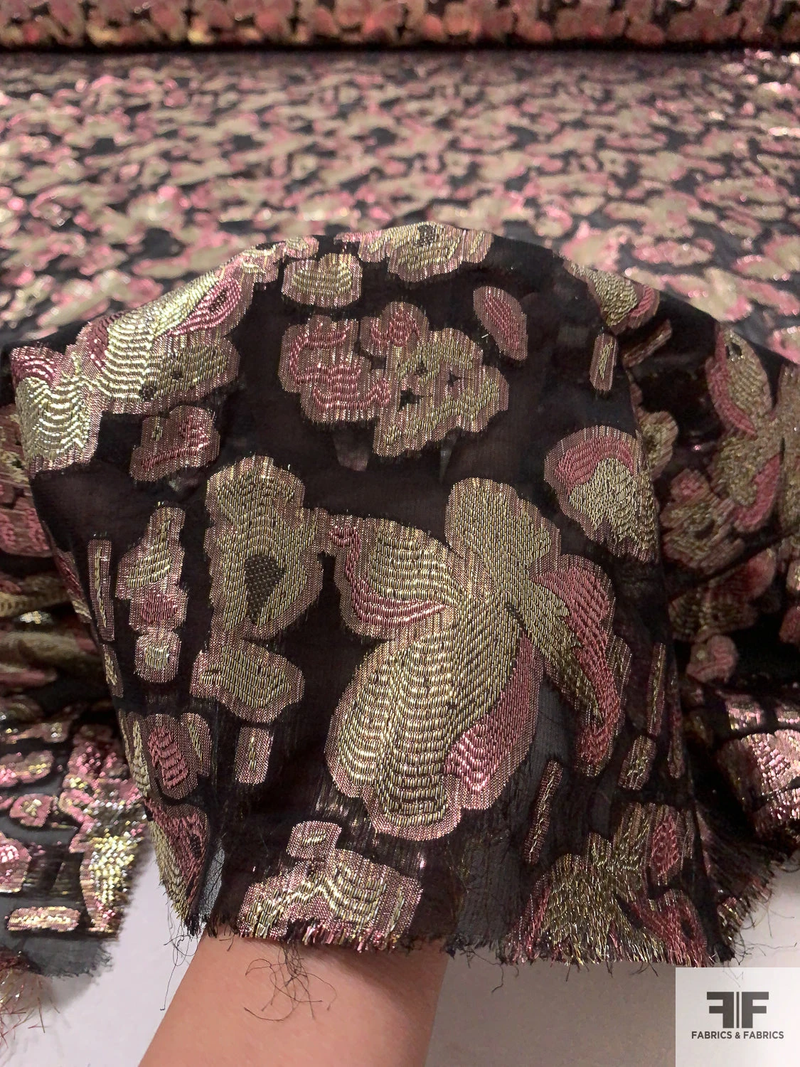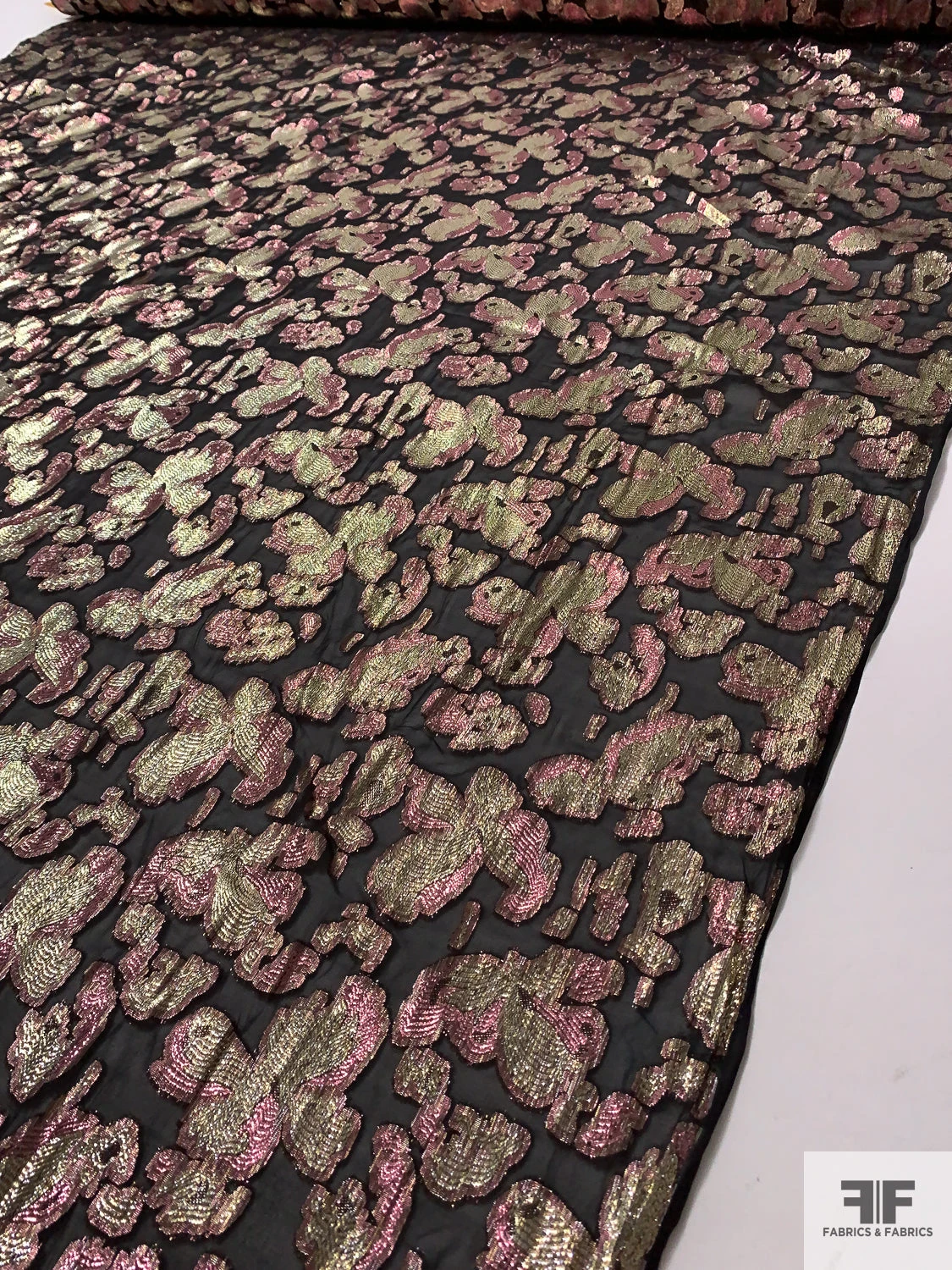 A dramatic statement fabric with a couture edge, this Italian silk chiffon from J Mendel features an abstract metallic fil coupé pattern in shimmering gold, pink, and black. The lightweight chiffon base has generous drape and a semi-sheer finish, while the textured fil coupé threads add dimension and depth. Ideal for standout gowns, sheer layers, or elevated costume design—this one’s for the bold and the skilled.