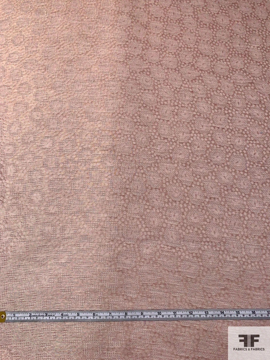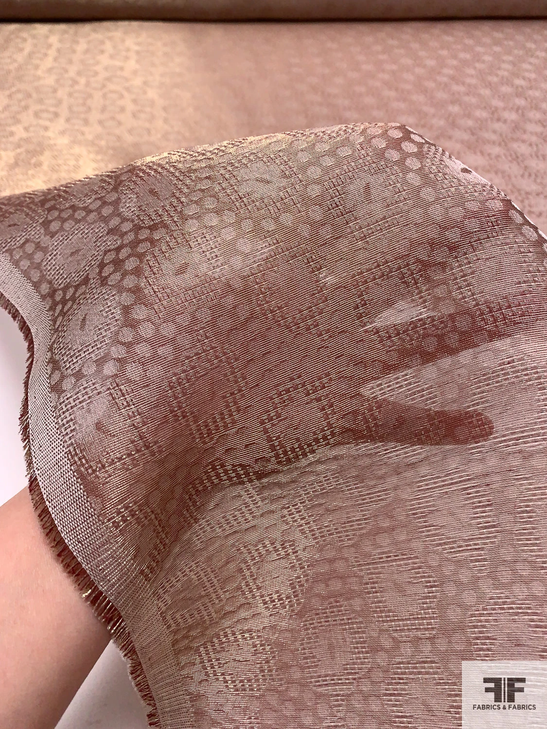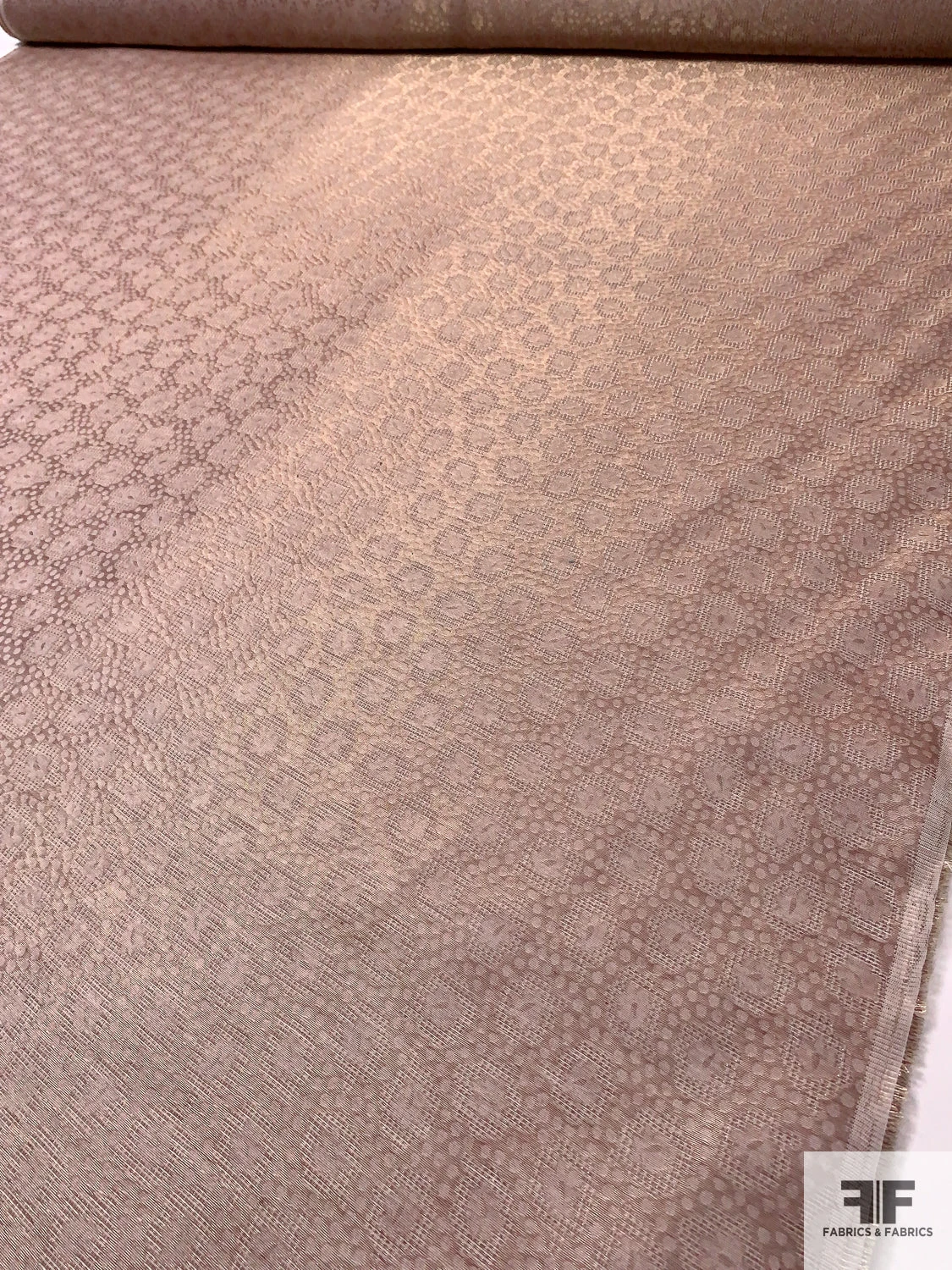 Luminous and romantic, this Swiss-made metallic jacquard gazar features an intricate mix of circles and florals in dusty rose and shimmering gold. The sheer body, slightly textured finish, and minimal drape offer sculptural structure—perfect for couture gowns, voluminous skirts, and statement-making costumes with a refined, opulent glow.