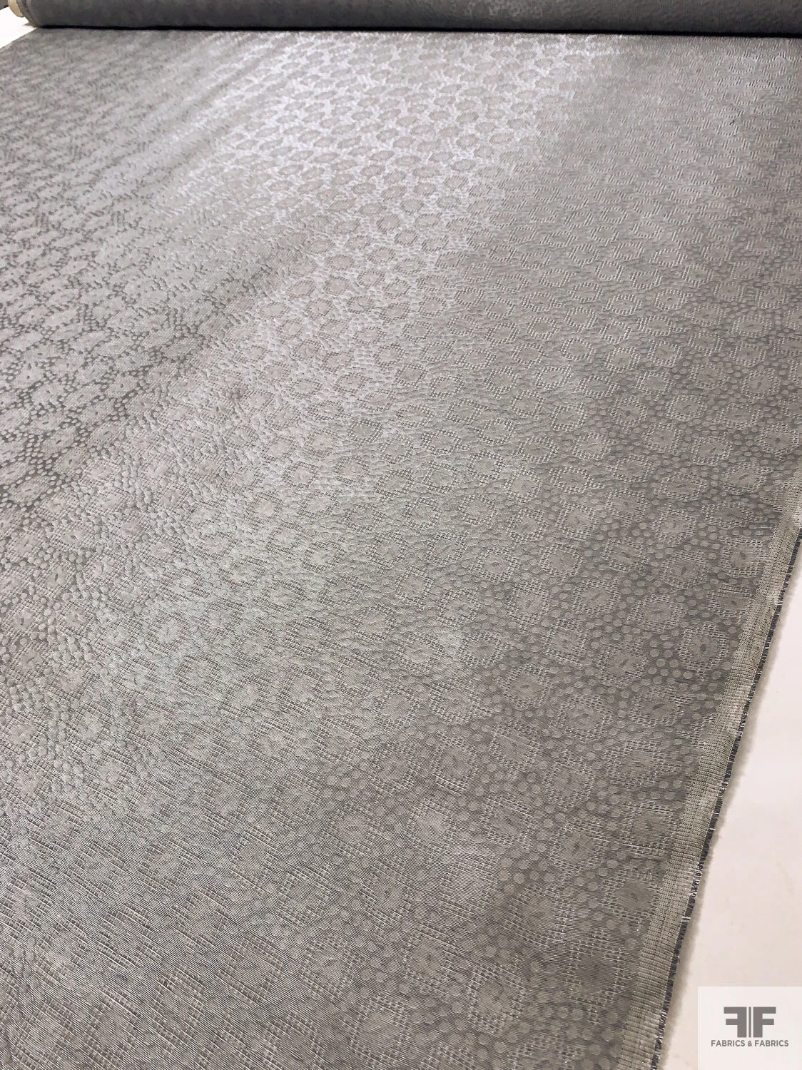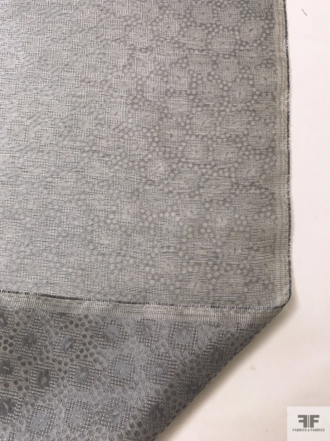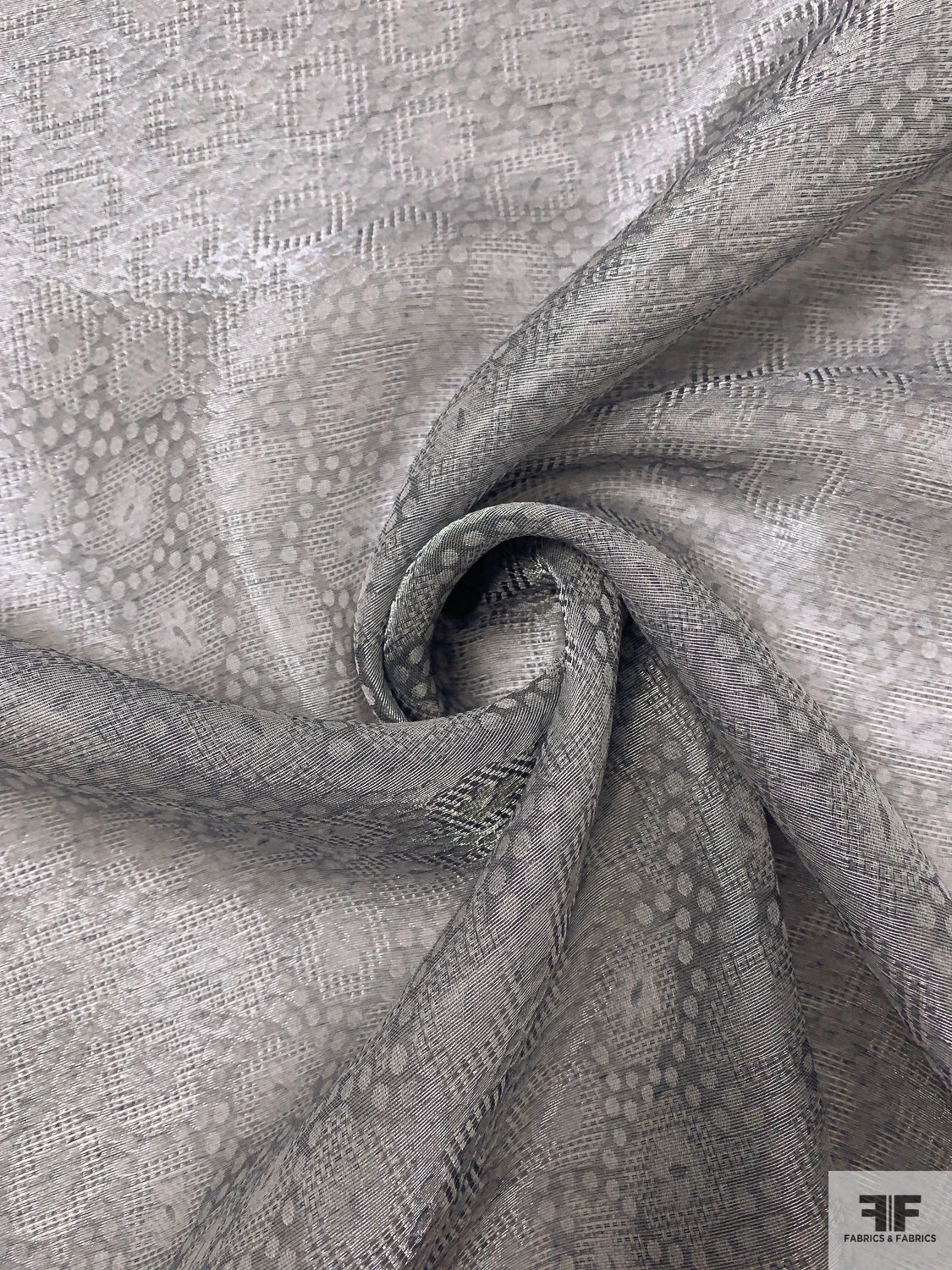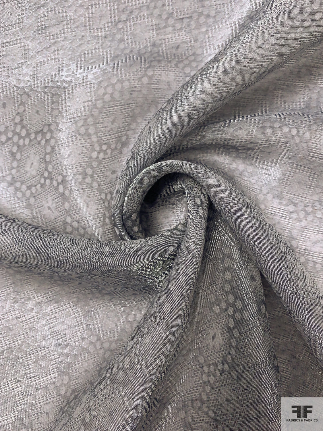 Sophisticated with a touch of whimsy, this Swiss-made metallic jacquard gazar features a delicate interplay of circles and florals in shimmering grey and silver. The sheer, slightly textured surface and minimal drape lend crisp volume—perfect for structured gowns, couture skirts, and costume designs that balance elegance with modern texture.