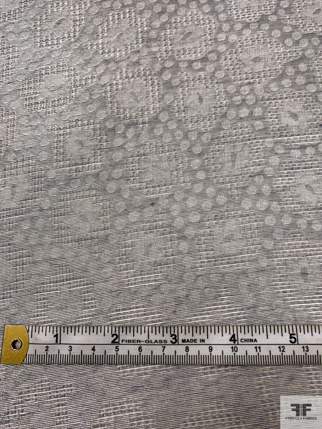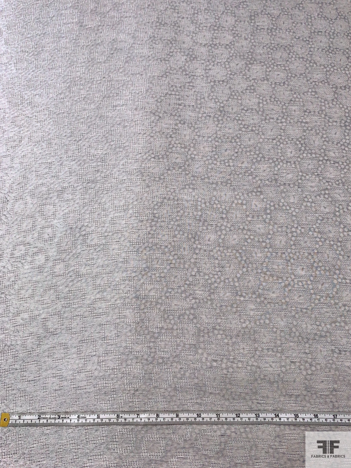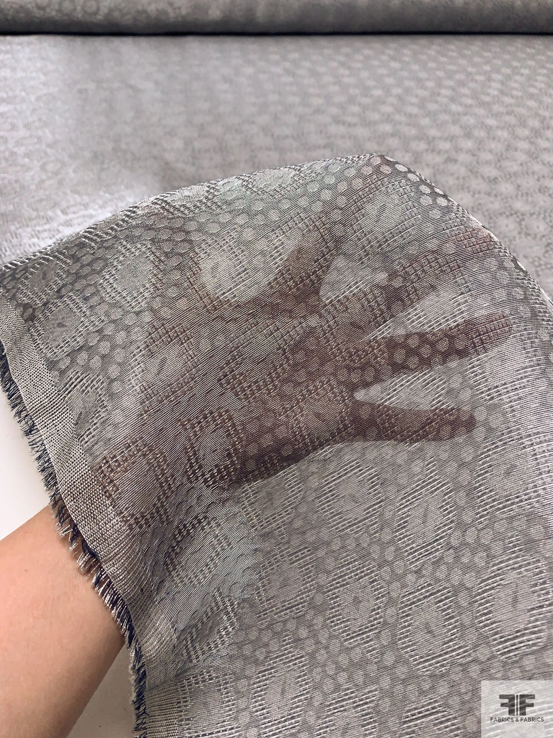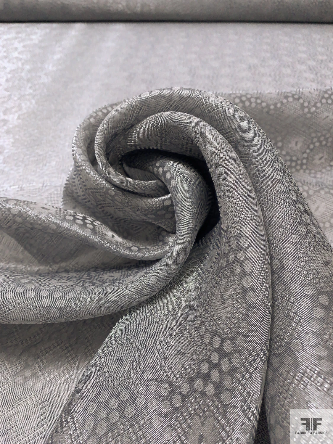 Sophisticated with a touch of whimsy, this Swiss-made metallic jacquard gazar features a delicate interplay of circles and florals in shimmering grey and silver. The sheer, slightly textured surface and minimal drape lend crisp volume—perfect for structured gowns, couture skirts, and costume designs that balance elegance with modern texture.
