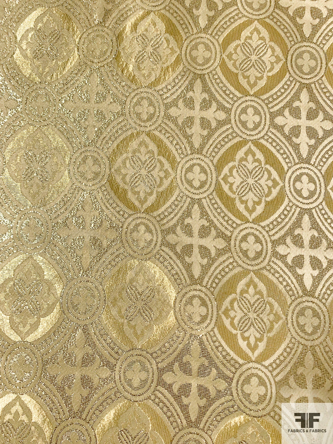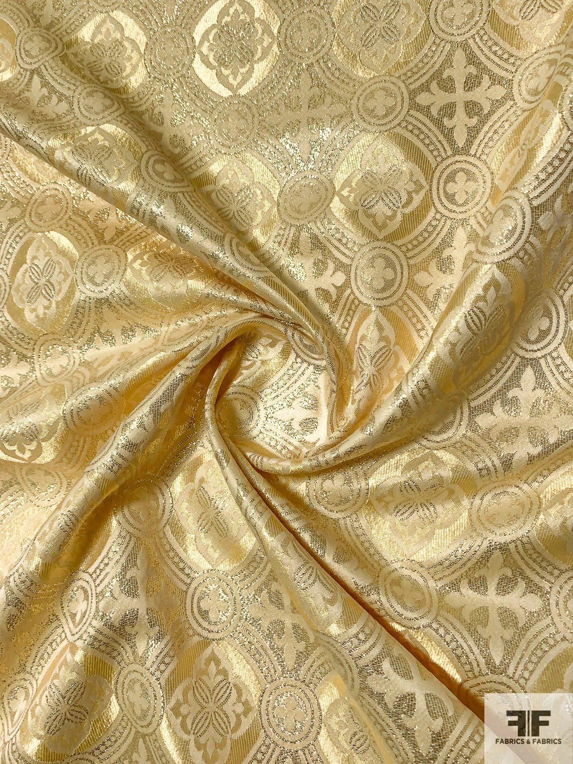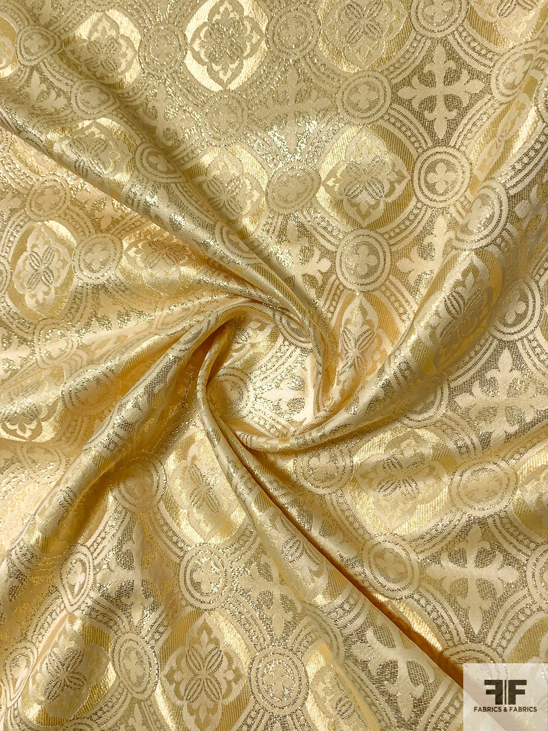 A gorgeous, light weight, gold brocade in clergyman style pattern. High sheen, minimal drape. Ideal for costume and high fashion with a Baroque/Renaissance influence.