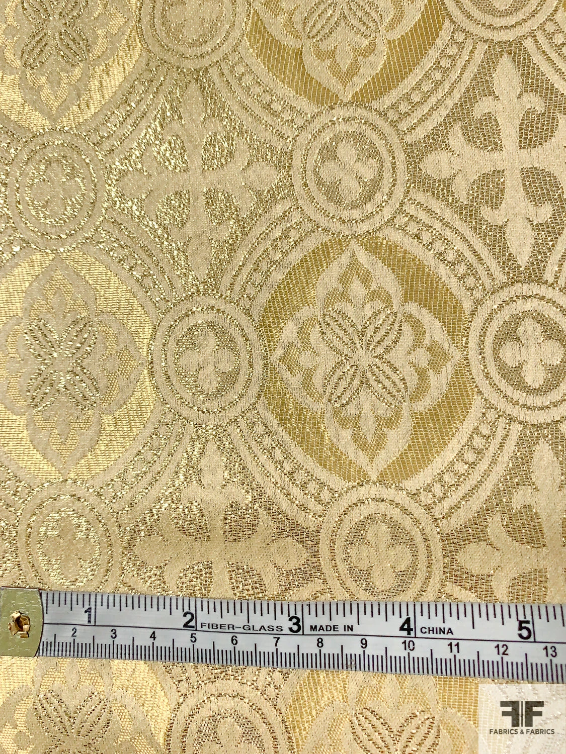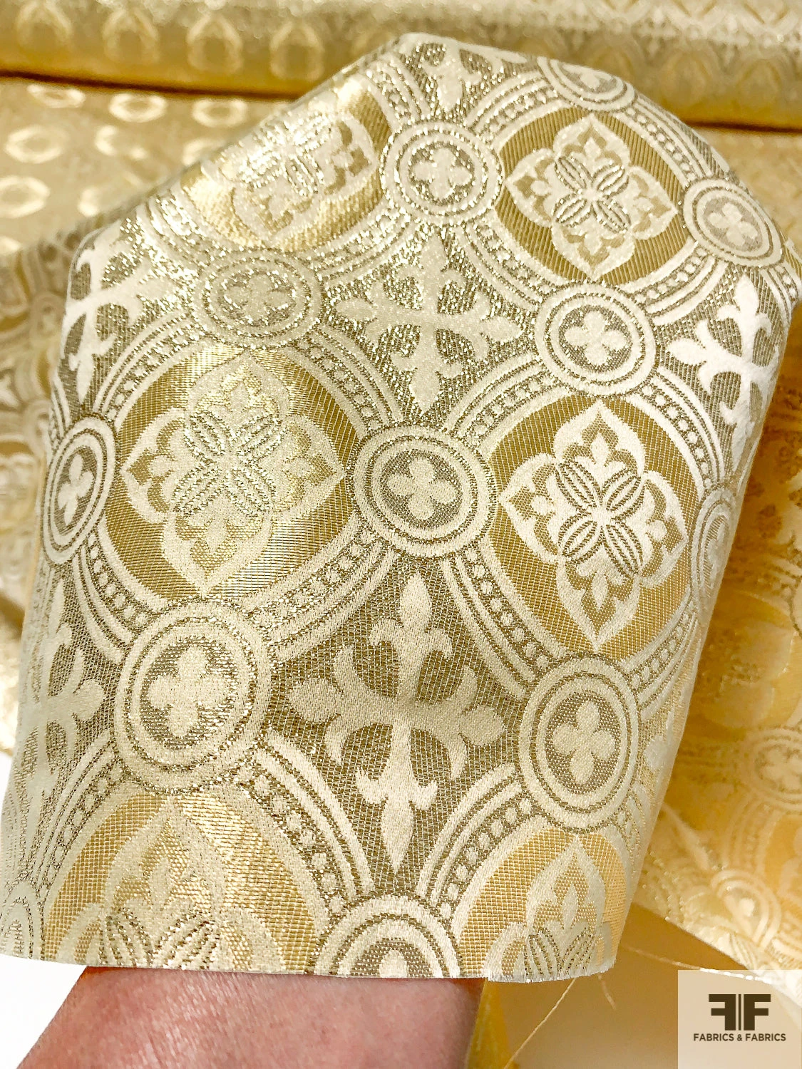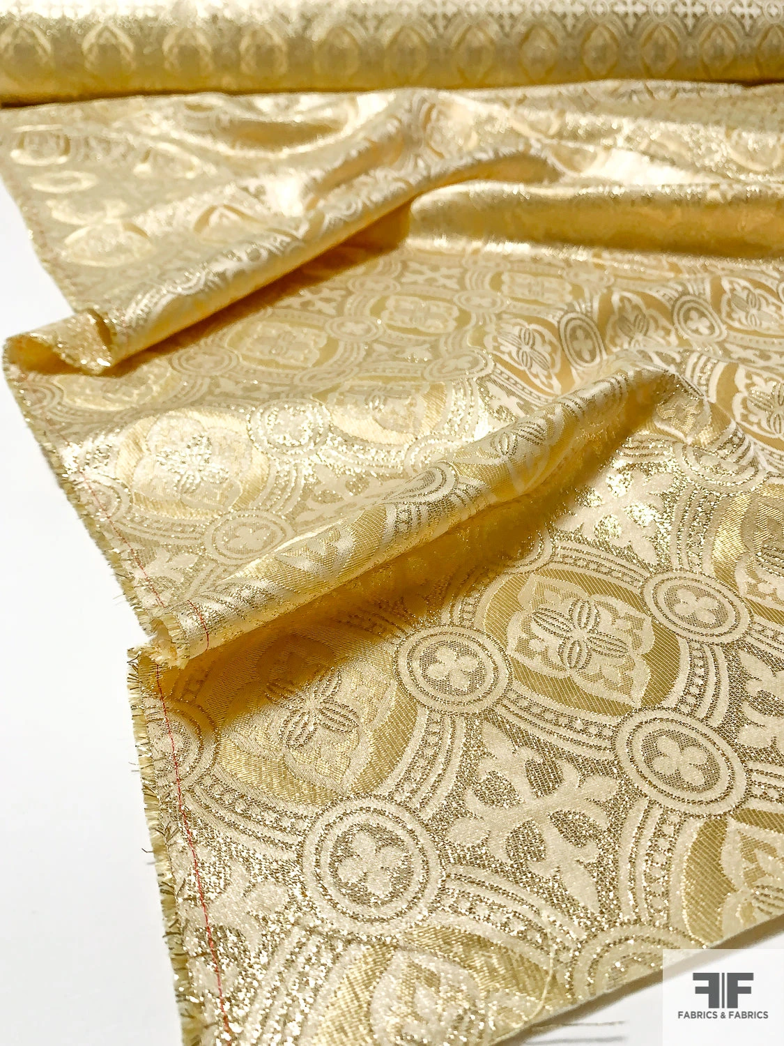 A gorgeous, light weight, gold brocade in clergyman style pattern. High sheen, minimal drape. Ideal for costume and high fashion with a Baroque/Renaissance influence.
