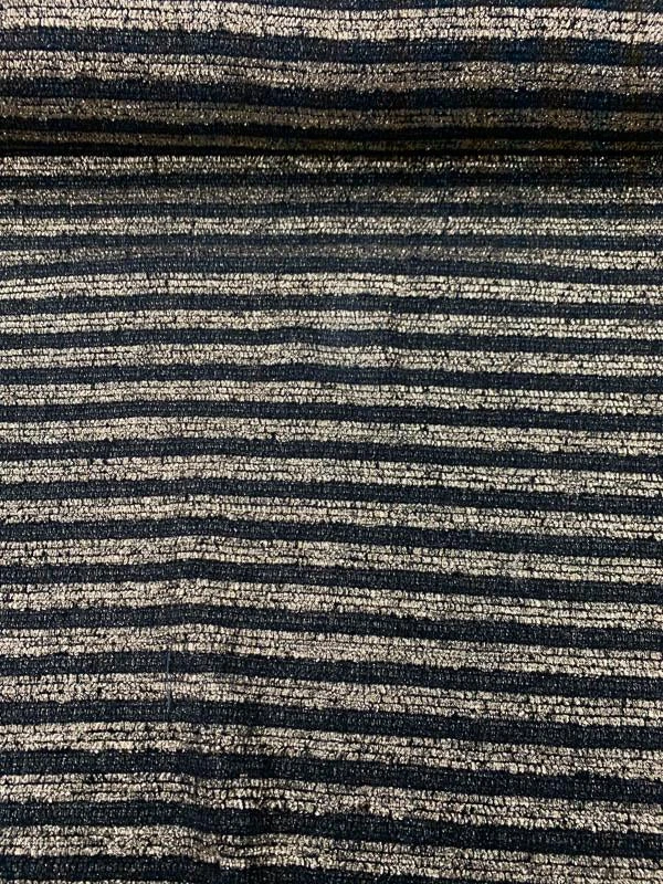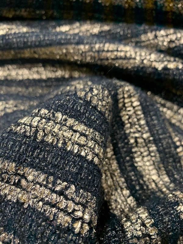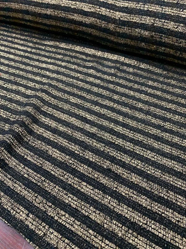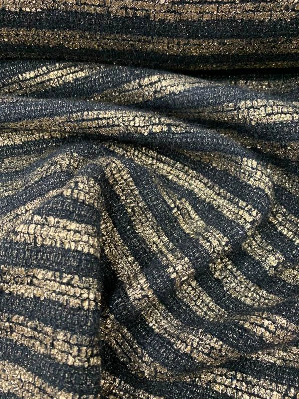 Glitter and glam marks this metallic foil striped printed woven wool tweed coating European designer fashion fabric in black and gold.