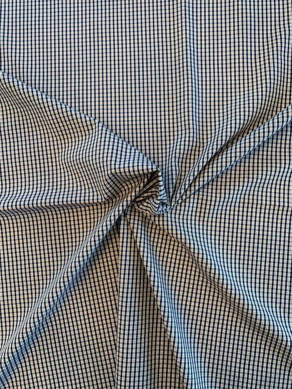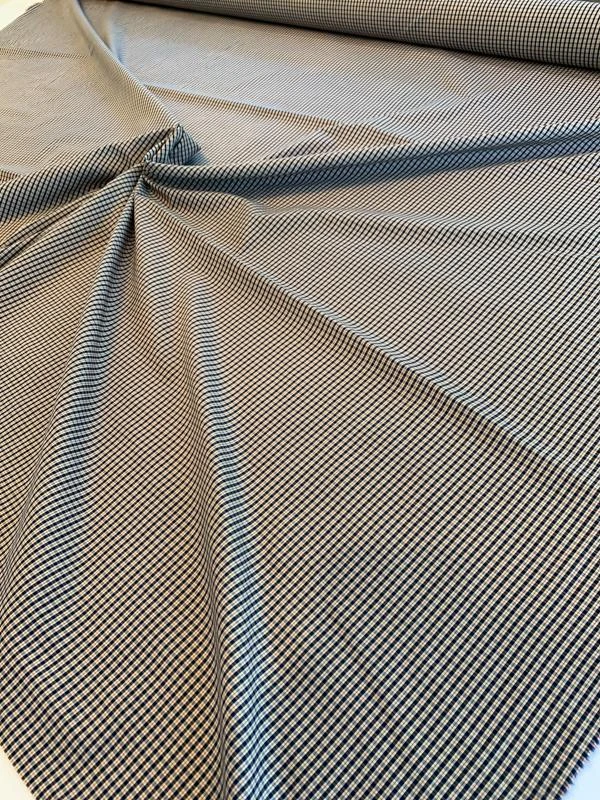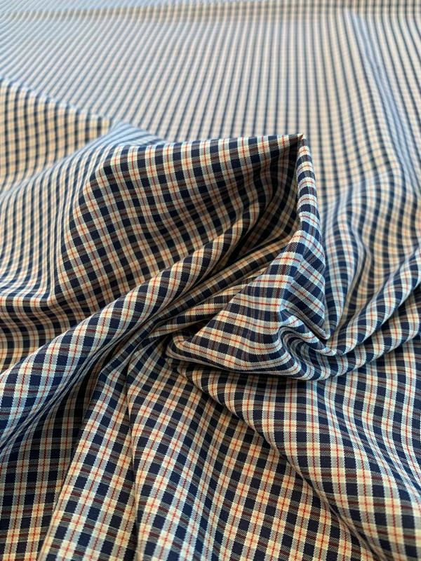 You’ll be pleasantly mesmerized by the hypnotic pattern and colors of this mini plaid yarn-dyed cotton shirting designer fashion fabric in blue, ivory, and red.