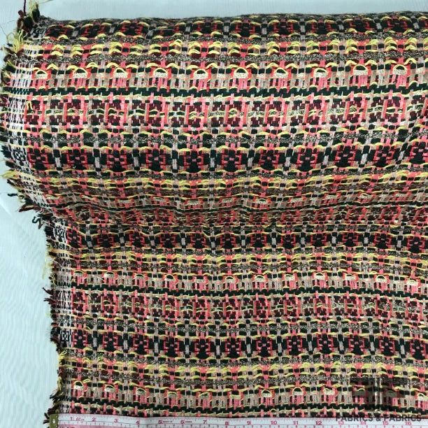 This interesting wool tweed features alternating threads in width in a bold color choice of yellow, pink, dark green, red, and metallic silver. The tweed is medium weight and soft to the touch. This fabric is perfect for a winter jacket!