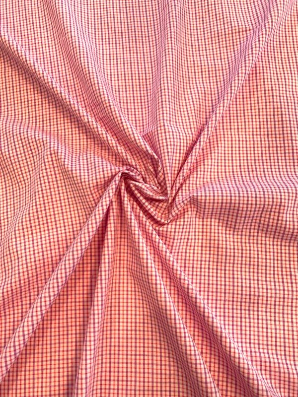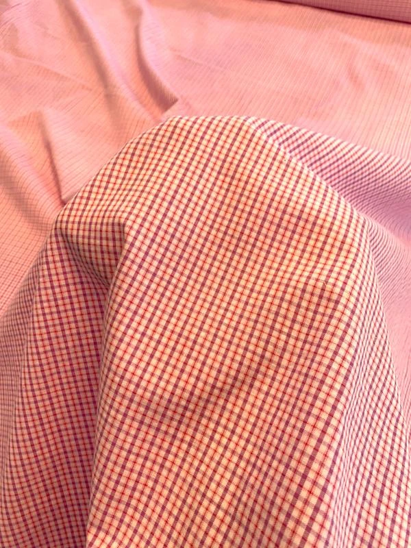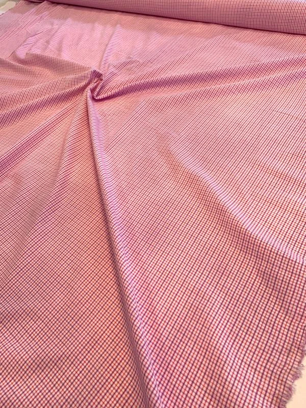 This plaid semi-seersucker cotton shirting designer fashion fabric in magenta, white, and red would be perfect when used to make clothing for spring and summer wear.