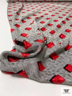 Squares And Micro Striped Printed Silk Charmeuse Jacquard Panel – Red / Black / Lightest Grey