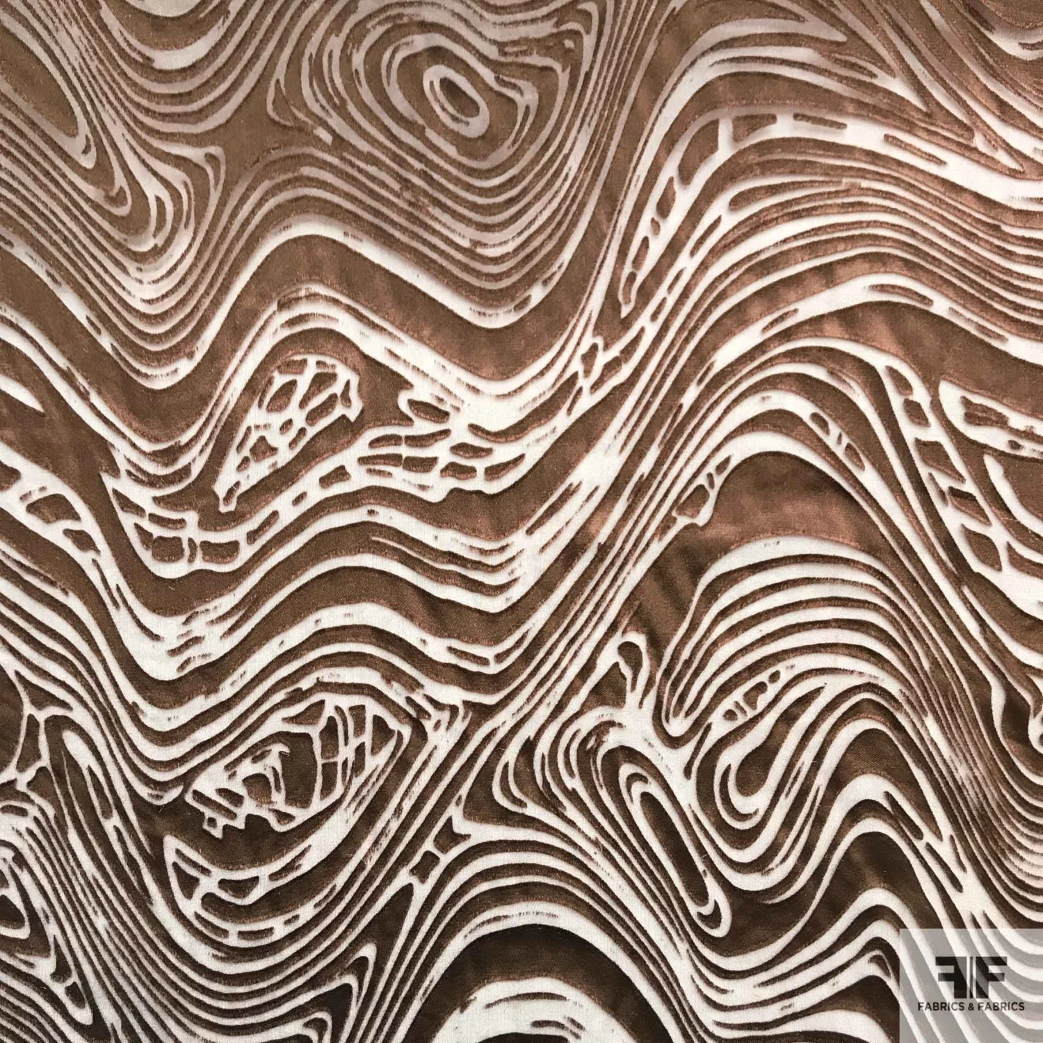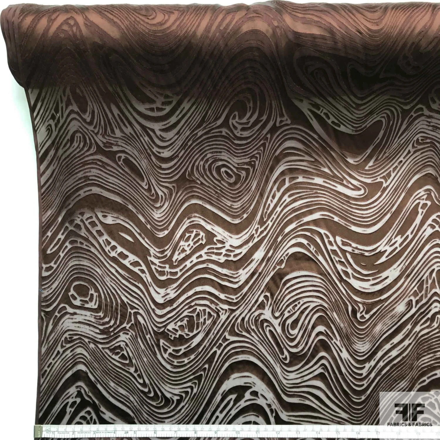 This fun and inspired chocolate brown burnout silk features a spiraling, marbled pattern. The lightweight chiffon can be used for a fabulous dress, blouse or shawl.