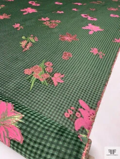 Italian Gingham Floral Fil CoupĂ© Silk Gazar With Lurex Detailing – Cool Forest Green / Black / Pink