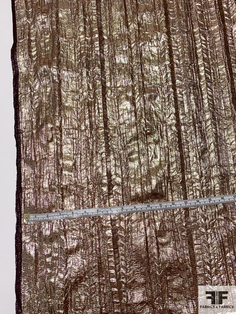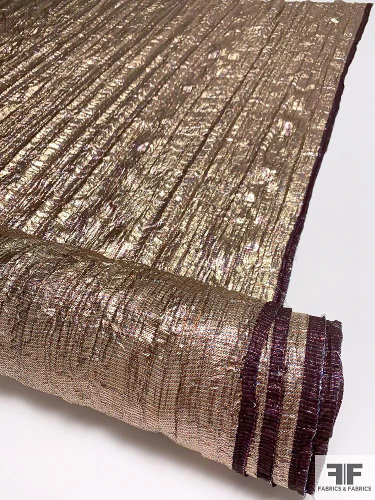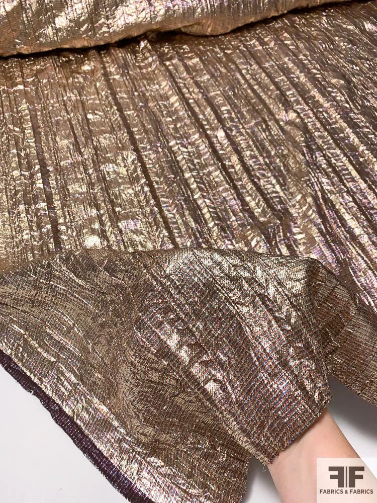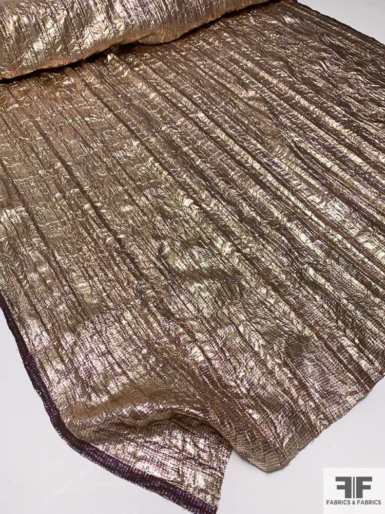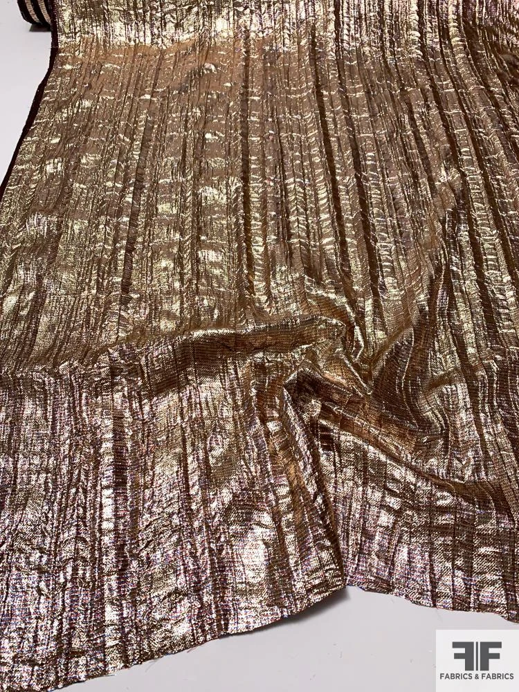Exquisitely spun in limited-edition artisan batches, this Lurex-blend lamé shimmers in a rich multicolor gold. Its featherlight body and crisp drape hold a delicate, crinkled pleat that catches the light like liquid metal. Ideal for a evening gown that skims the body, a sculptural cocktail dress with folded accents, a sleek jumpsuit with slender straps, or a show-stopping cape that billows with every step, each piece becomes a testament to refined, modern glamour.