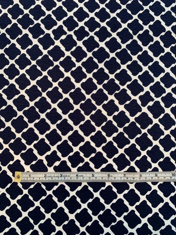 This Swiss houndstooth-like printed cotton pique designer fashion fabric in midnight navy and white is a bold, strong and confident pattern.