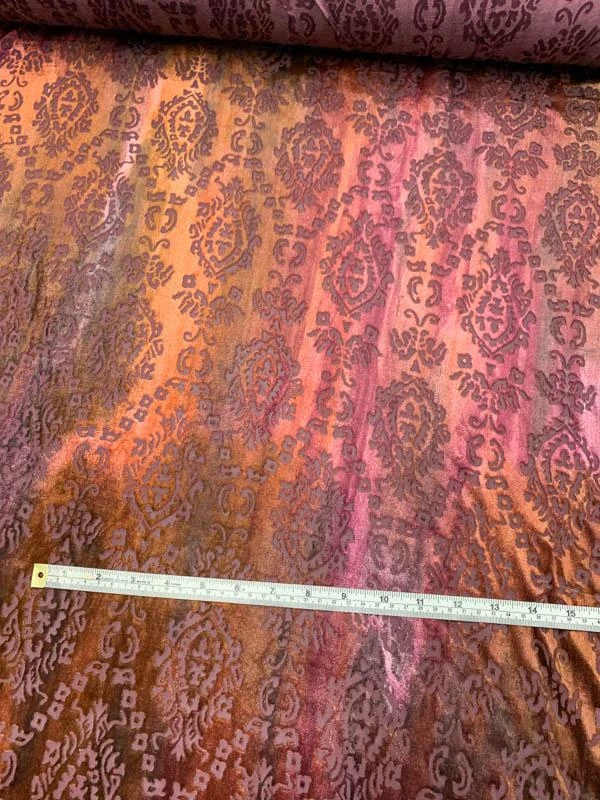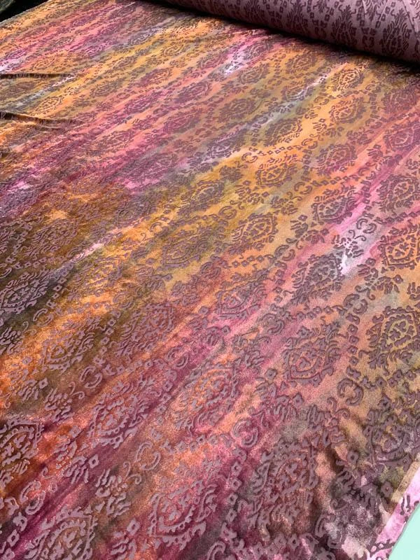 The delicate, watercolor-like rainbow of this tie-dye printed damask burnout stretch velvet designer fashion fabric in plum, purple, and orange feels almost magical.