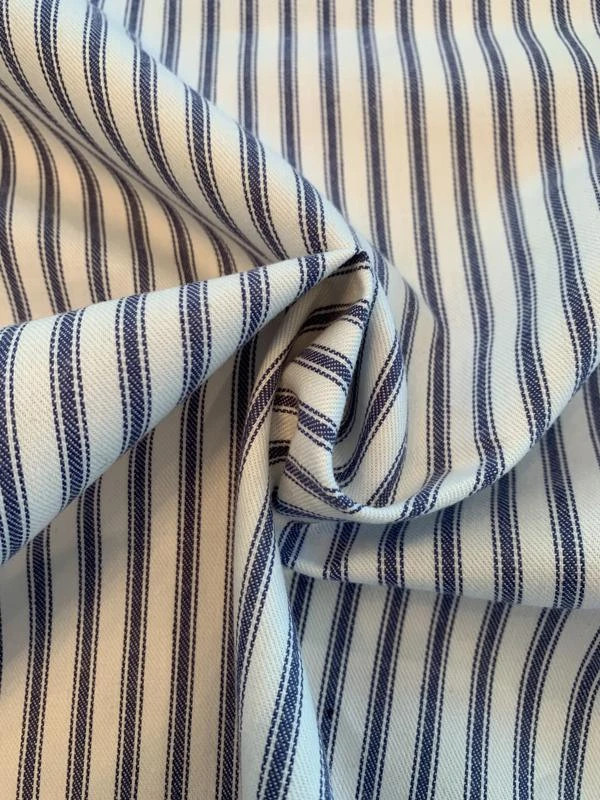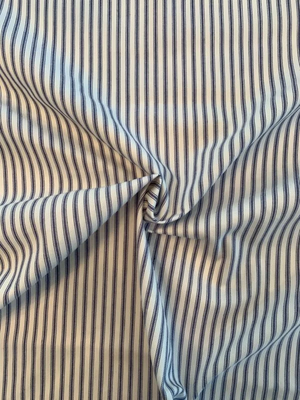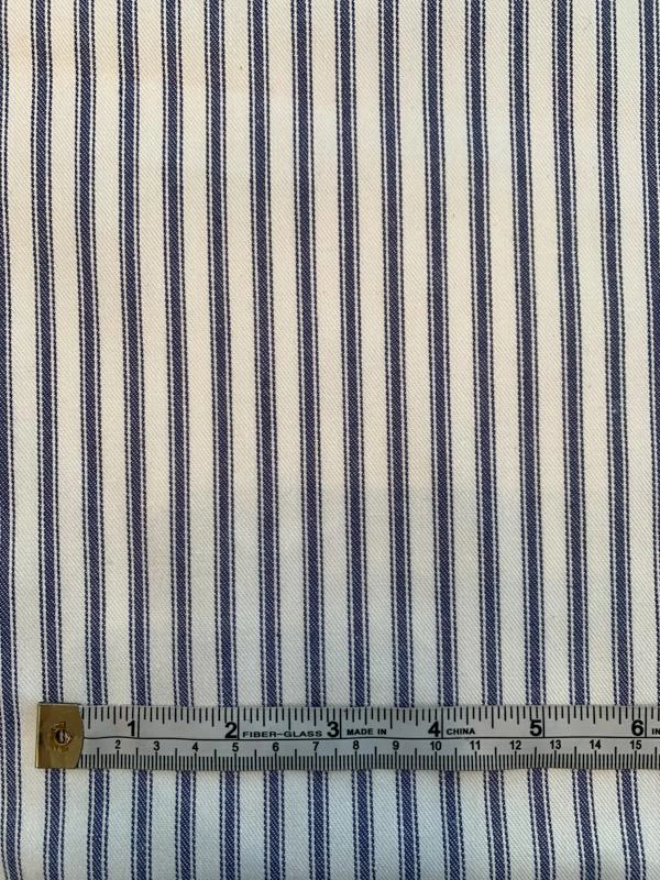 This vertical striped cotton twill designer fashion fabric in blue and white is ideal for statement trousers, dresses, jackets and even soft furnishings.