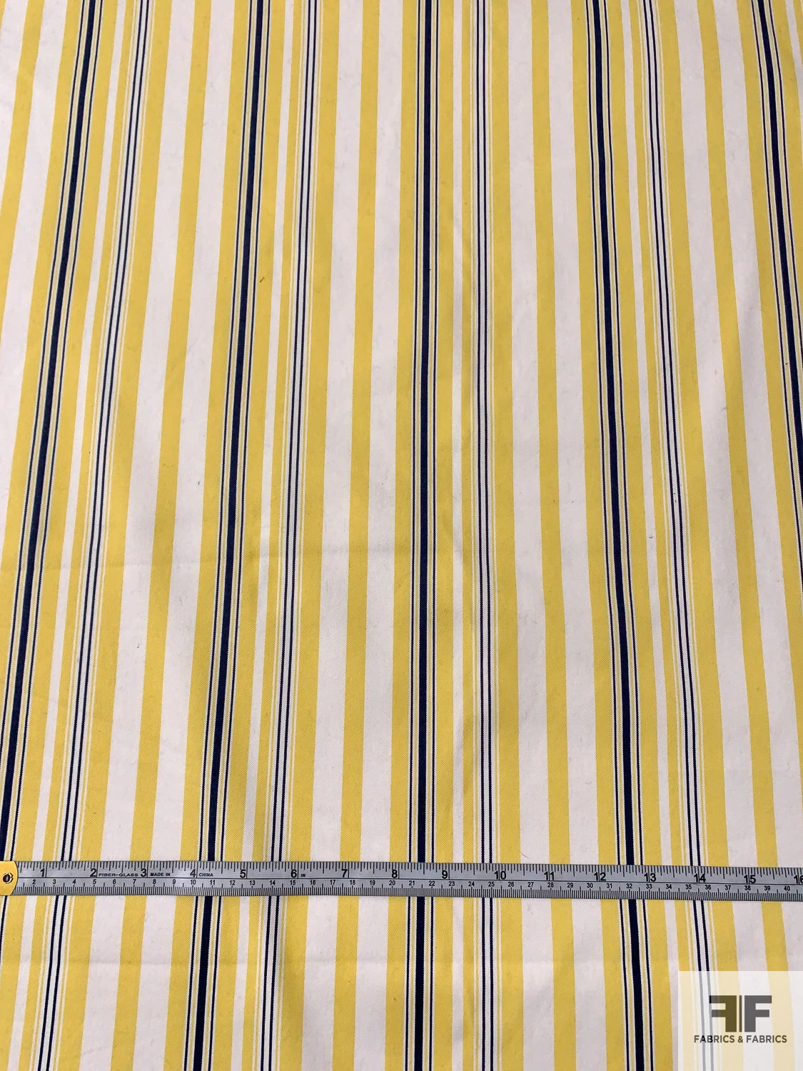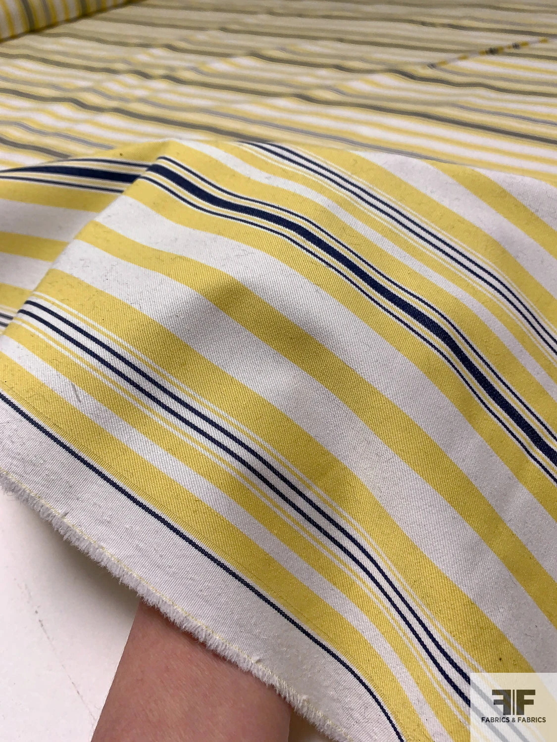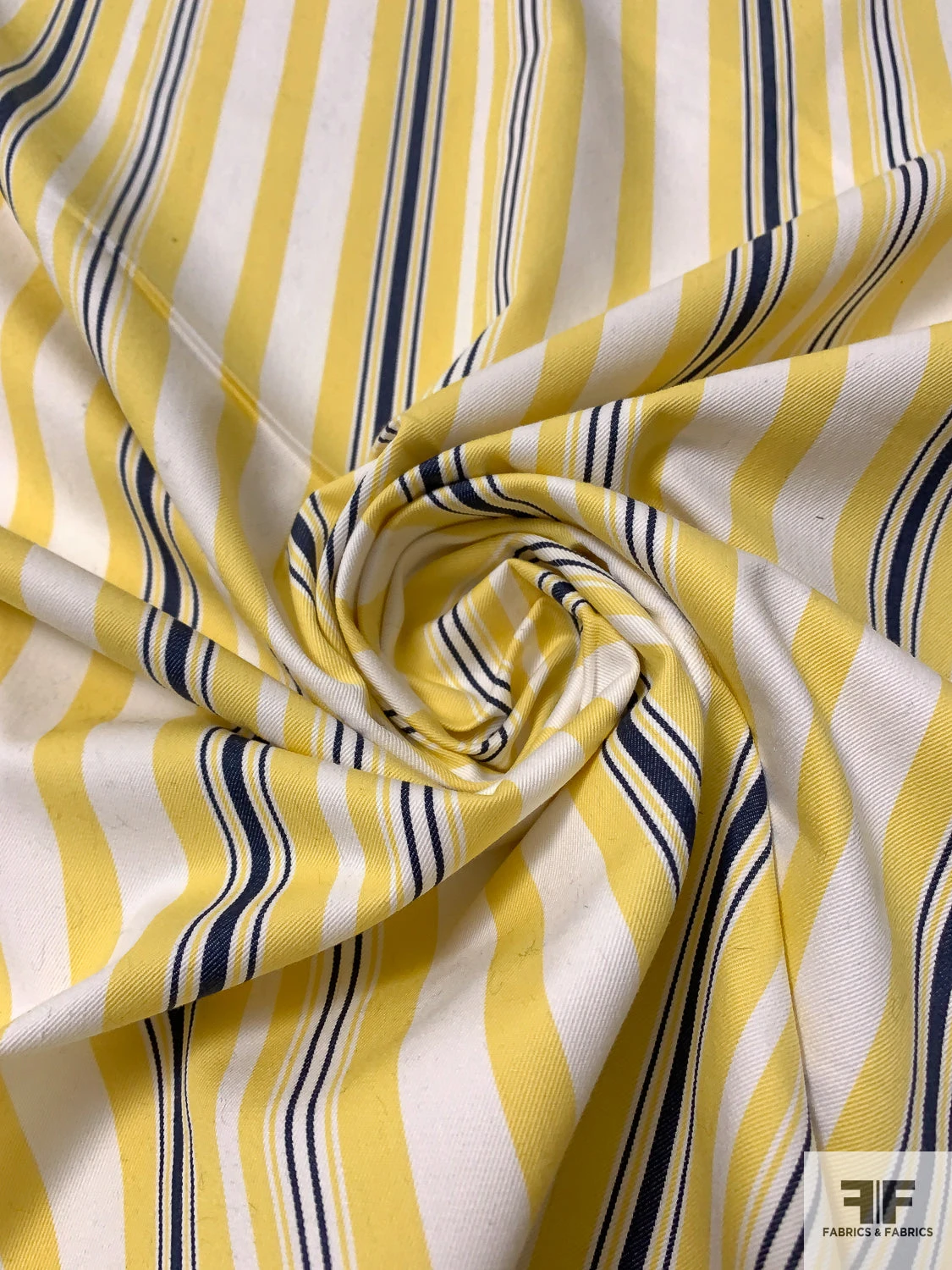 This vertical striped stretch cotton twill showcases a vibrant combination of yellow, navy, and white. The stretch cotton twill fabric offers comfort and flexibility, while the vertical stripes create a visually elongating effect. It’s perfect for creating tailored garments like trousers, skirts, and jackets with a contemporary and stylish look.