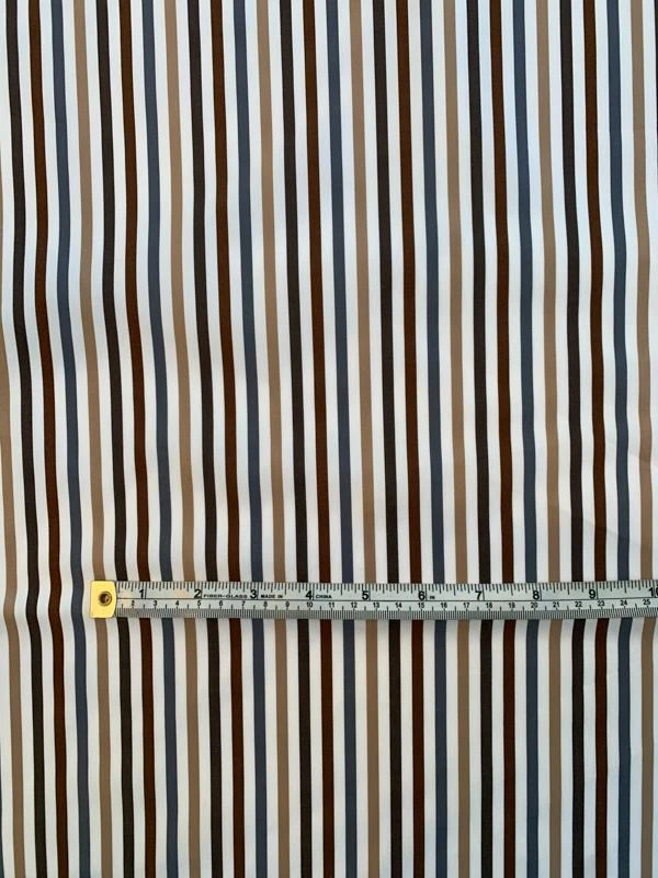 The complementary contemporary colors make this vertical striped yarn-dyed cotton shirting designer fashion fabric in brown, tan, grey, and white feel refreshingly current and modern.