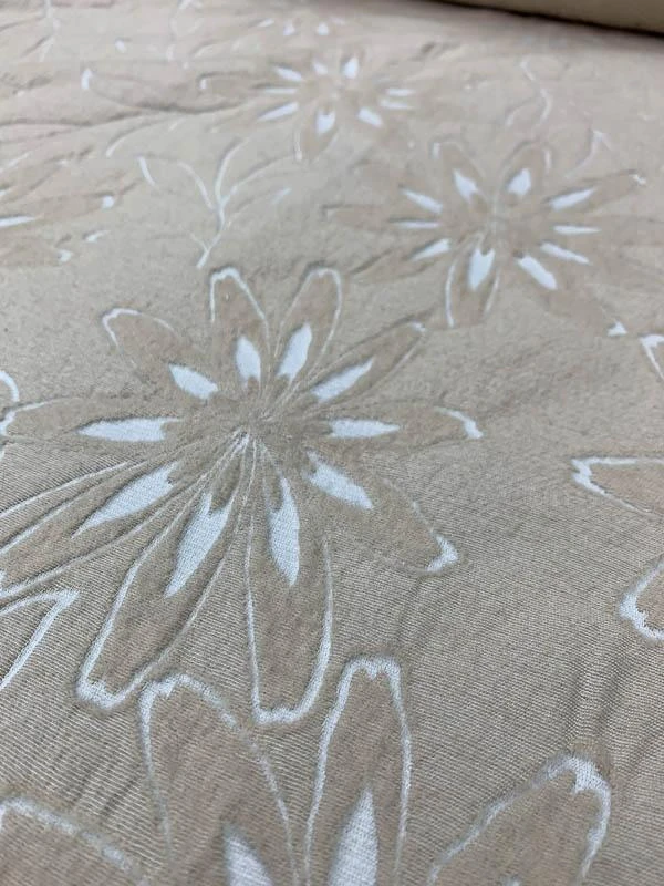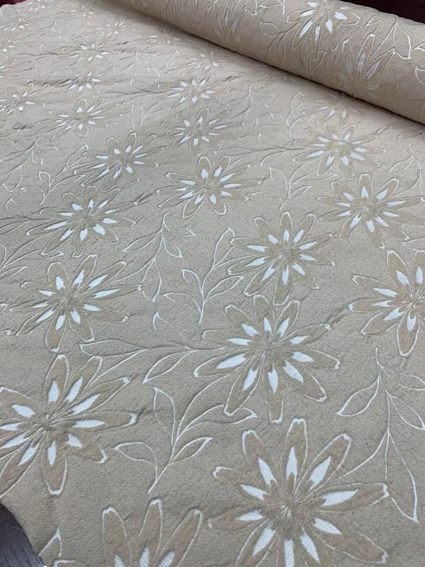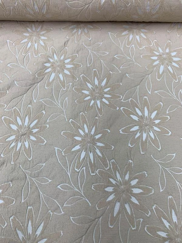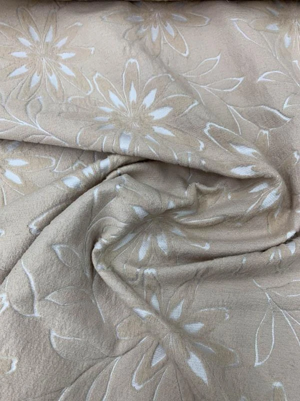 This is an extremely durable woven floral burnout-like wool suiting designer fashion fabric in tan and ivory that’s perfect for office separates.